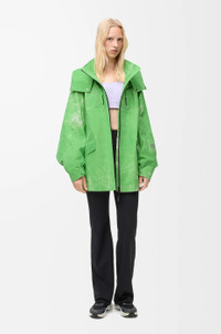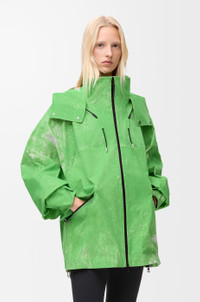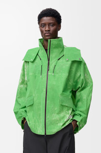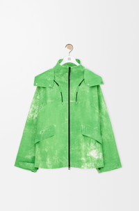 Jacket in medium-weight technical shell with a one-of-a-kind flocked finish featuring side zips for ventilation and an adjustable drawstring hem. - Relaxed fit, regular length - Adjustable hood with drawstring and snap button fastening - Two-way zip front fastening - Snap button cuffs - Zipped flap pockets - Reflective Anagram On print placed on the elbow - Reflective LOEWE On print placed at the back Colour: Green Main material: Polyester/Nylon/Elasthane Weight: 0.9 kg Materials & care Main Material: 62% polyester 34% polyamide 4% elastane