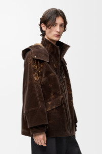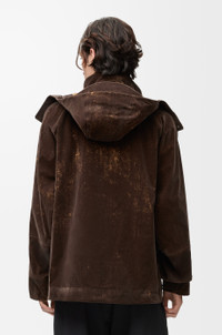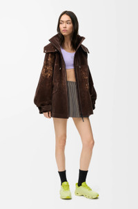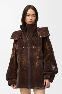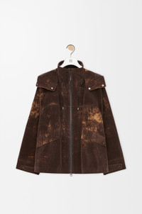 Jacket in medium-weight technical shell with a one-of-a-kind flocked finish featuring side zips for ventilation and an adjustable drawstring hem. - Relaxed fit, regular length - Adjustable hood with drawstring and snap button fastening - Two-way zip front fastening - Snap button cuffs - Zipped flap pockets - Reflective Anagram On print placed on the elbow - Reflective LOEWE On print placed at the back Colour: Chocolate Brown Main material: Polyester/Nylon/Elasthane Weight: 0.9 kg Materials & care Main Material: 62% polyester 34% polyamide 4% elastane