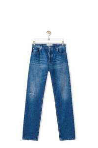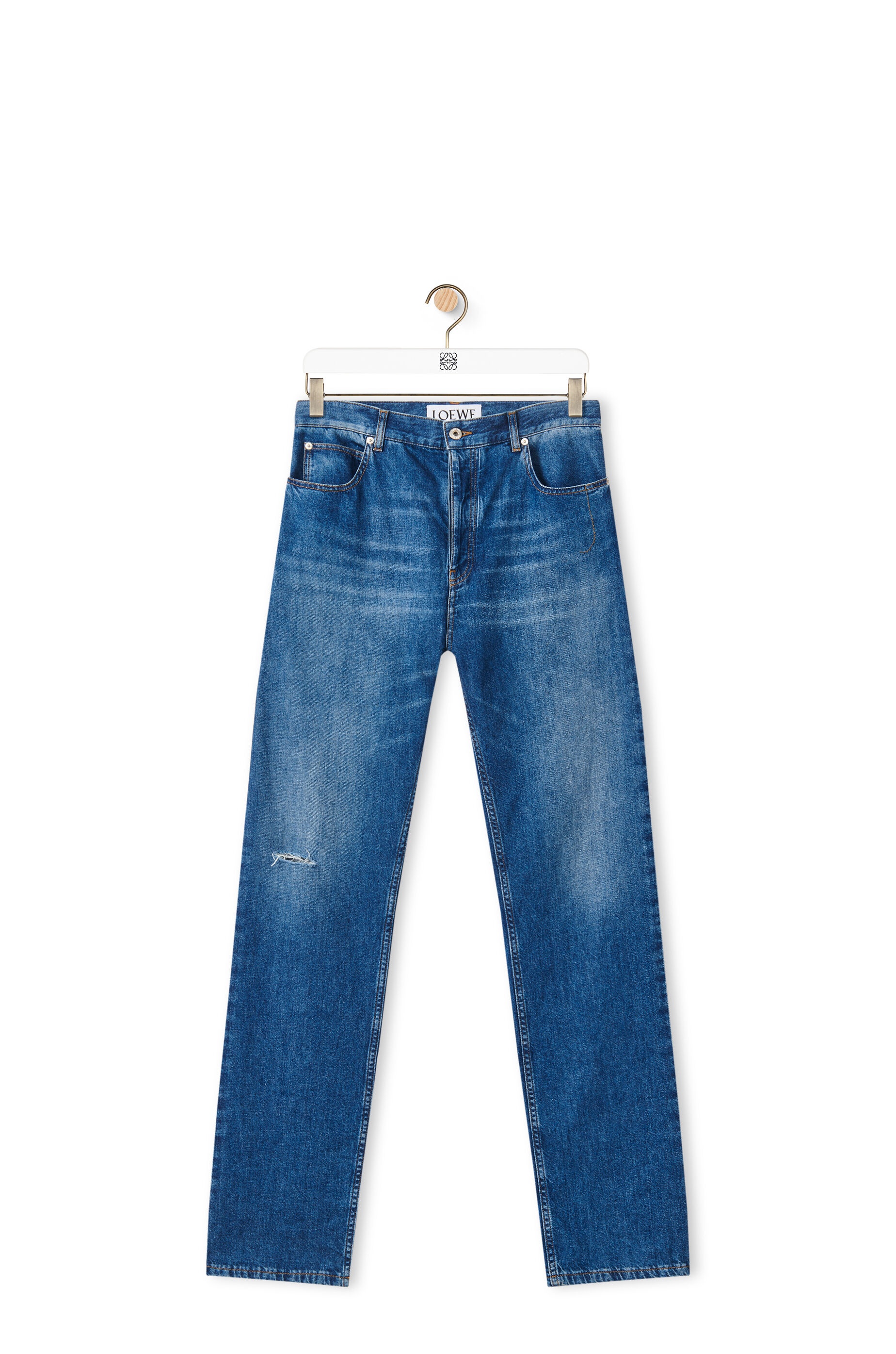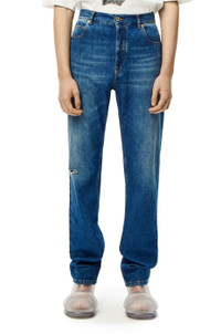 Straight leg five pocket jeans in washed denim with a ripping detail at the knee. - Regular fit - Concealed button fly fastening - Embossed LOEWE calfskin tab Details - Colour: Indigo Blue - Main material: Cotton - Weight : 0.54 kg - Model ID: H526Y11X22 - Made in: Italy