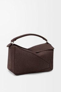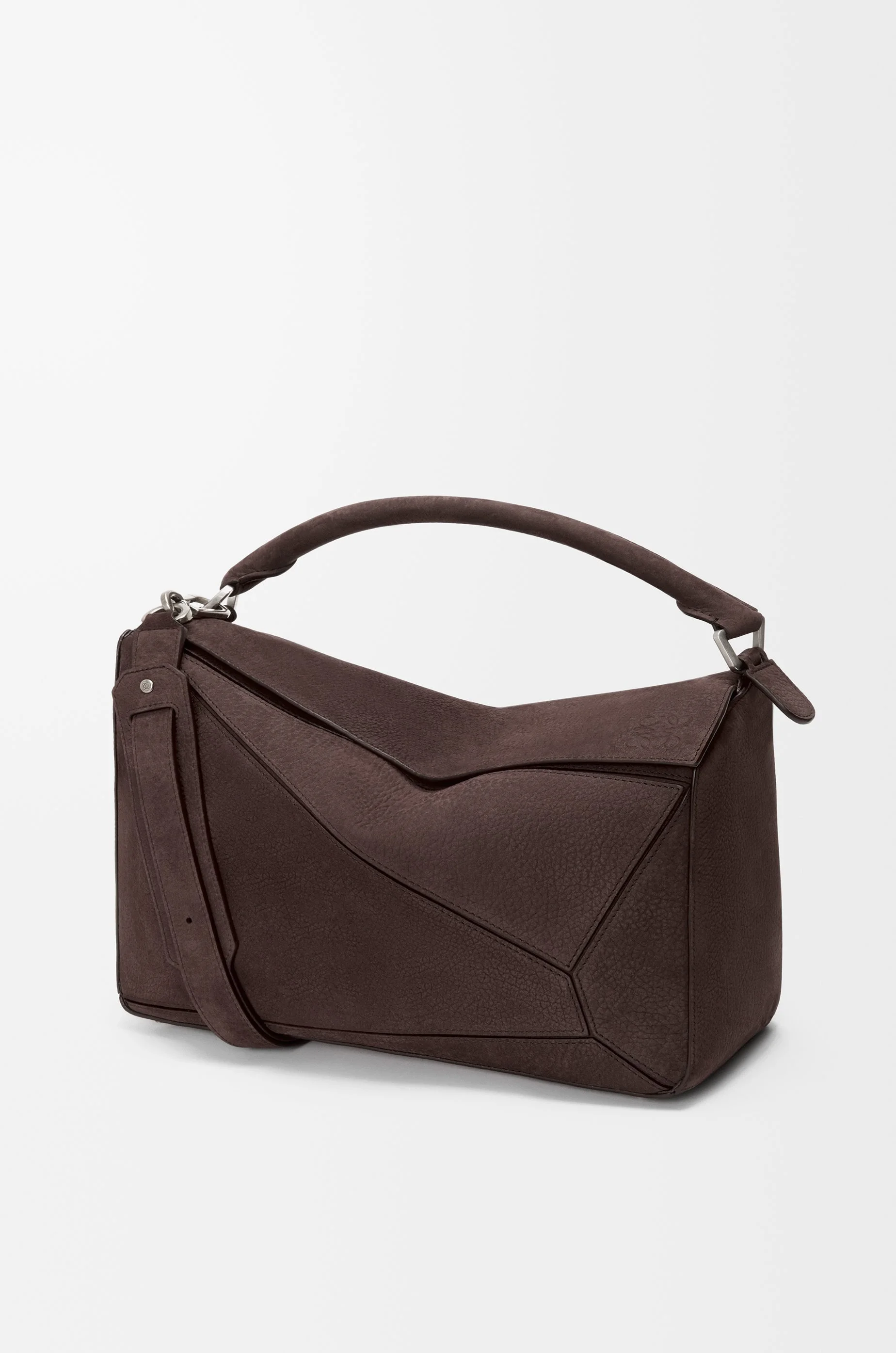 The Puzzle is defined by its distinctive geometric lines and its cuboid form. This large version is crafted in grained nubuck. - Shoulder, crossbody or hand carry - Detachable and adjustable strap - Zip closure with calfskin pull - One external rear zipped pocket, two internal slip pockets - Metal feet - Herringbone cotton canvas lining - Embossed Anagram Colour: Dark Chestnut Metallic colour: Palladium Main material: Grained nubuck Strap length: 79-119 cm Strap drop: 36 - 57 cm Handle drop: 10 cm Weight: 1.05 kg Height: 21.5 cm Width: 33 cm Depth: 14.7 cm Made in: Spain