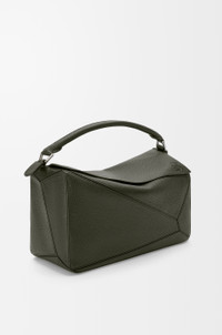 The Puzzle is defined by its distinctive geometric lines and its cuboid form. This large version is crafted in supple grained calfskin. - Shoulder, crossbody or hand carry - Detachable and adjustable strap - Zip closure with calfskin pull - One external rear zipped pocket, two internal slip pockets - Metal feet - Suede lining - Embossed Anagram Colour: Dark Khaki Metallic colour: Palladium Main material: Supple grained calf Strap length: 79-119 cm Strap drop: 36 - 57 cm Handle drop: 10 cm Weight: 1.09 kg Height: 21.5 cm Width: 33 cm Depth: 14.7 cm Made in: Spain