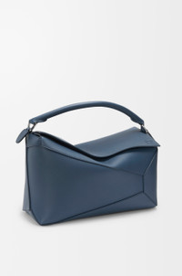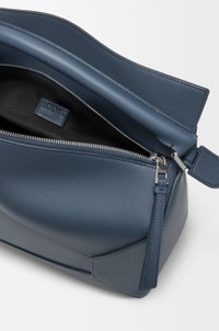 The Puzzle Edge is defined by its distinctive geometric lines and its cuboid form. It differs to the classic construction in its overlapped panels with single stitch lines. This large version is crafted in classic calfskin. - Shoulder, crossbody or hand carry - Detachable and adjustable strap - Zip closure with calfskin pull - One external zip rear pocket, two internal slip pockets - Herringbone cotton canvas lining - Embossed Anagram Colour: Indigo Dye Metallic colour: Palladium Main material: Classic Calf Strap length: 79 - 117 cm Strap drop: 36 - 57 cm Handle drop: 10 cm Weight: 0.9 kg Height: 21.5 cm Width: 33 cm Depth: 14.7 cm Made in: Spain
