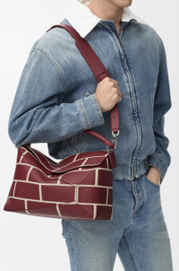 The Puzzle Edge is defined by its distinctive geometric lines and its cuboid form. It differs to the classic construction in its overlapped panels with single stitch lines. This large version is crafted in classic calfskin with a leather marquetry brick pattern. - Shoulder, crossbody or hand carry - Detachable and adjustable strap - Zip closure with calfskin pull - One external zip rear pocket, two internal slip pockets - Calfskin lining - Embossed Anagram Colour: Burnt Red Metallic colour: Palladium Main material: Classic Calf Strap length: 79 - 117 cm Strap drop: 36 - 57 cm Handle drop: 10 cm Weight: 0.9 kg Height: 21.5 cm Width: 33 cm Depth: 14.7 cm Made in: Spain