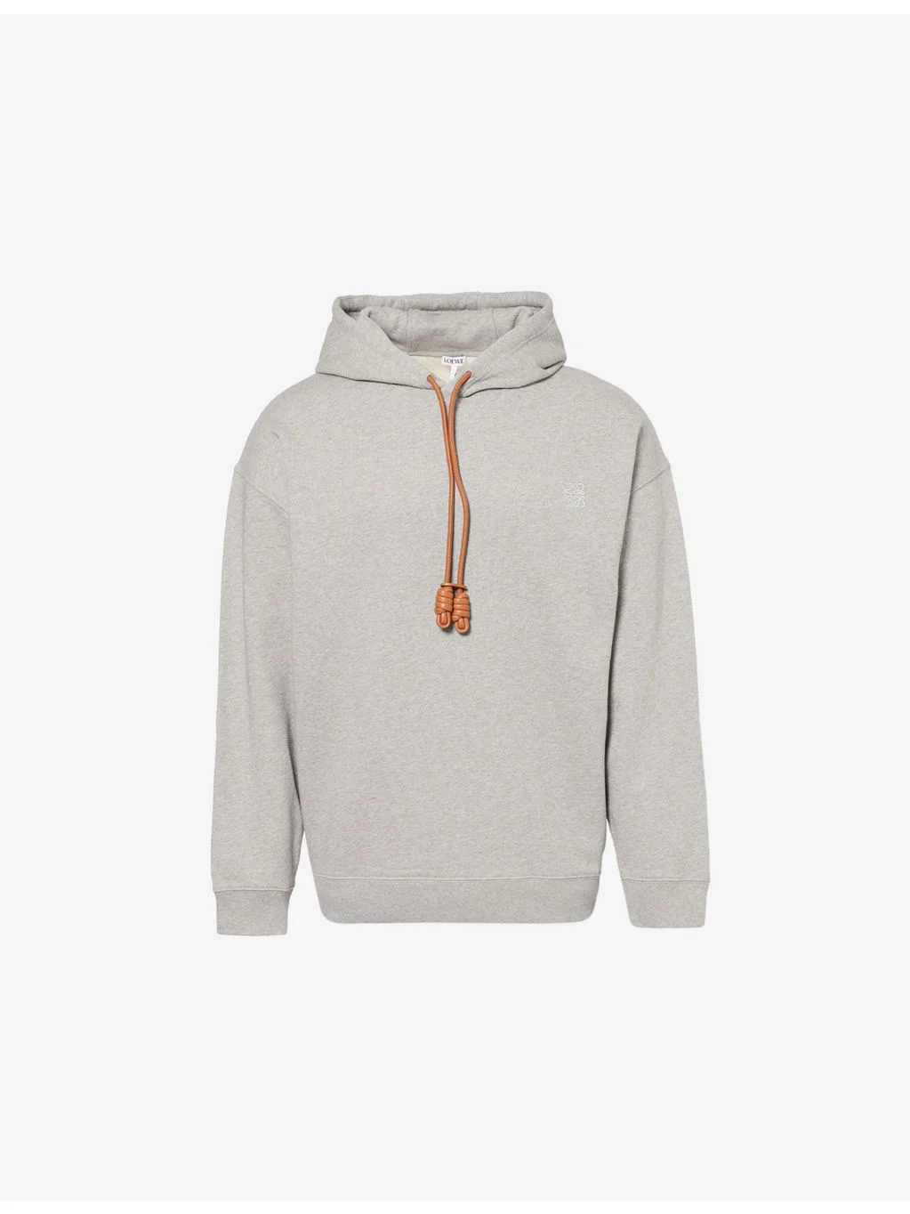 PRODUCT DETAILS - LOEWE cotton-jersey hoodie - 100% cotton; embellishments 100% lamb leather; embroidery 100% polyester; trims 100% cotton - Relaxed fit, leather drawstring at hoodie, long sleeves, anagram embroidery at front, all-over melange print, ribbed trims - Dry clean - Made in Portugal - Model is 6ft 2in/1.88m and wears a size medium - Midweight, stretchy Ref: R04565752