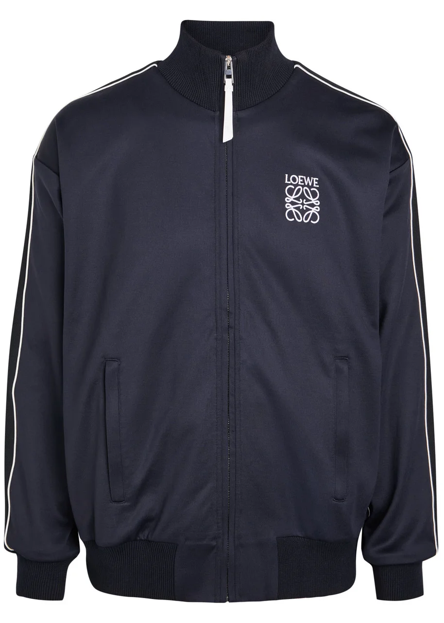 Info & Care Loewe jersey track jacket High-neck, piped panels through sleeves and sides, anagram embroidery at chest, zip-fastening side pockets, ribbed trims, mesh lining Zip fastening through front 56% polyamide, 44% cotton Machine wash Coordinating item;available Size & Fit Length shoulder to hem: 28 inches/ 71cm Midweight Relaxed fit Model is 6'1"/ 185cm, chest size 38.5 inches and wears a size medium
