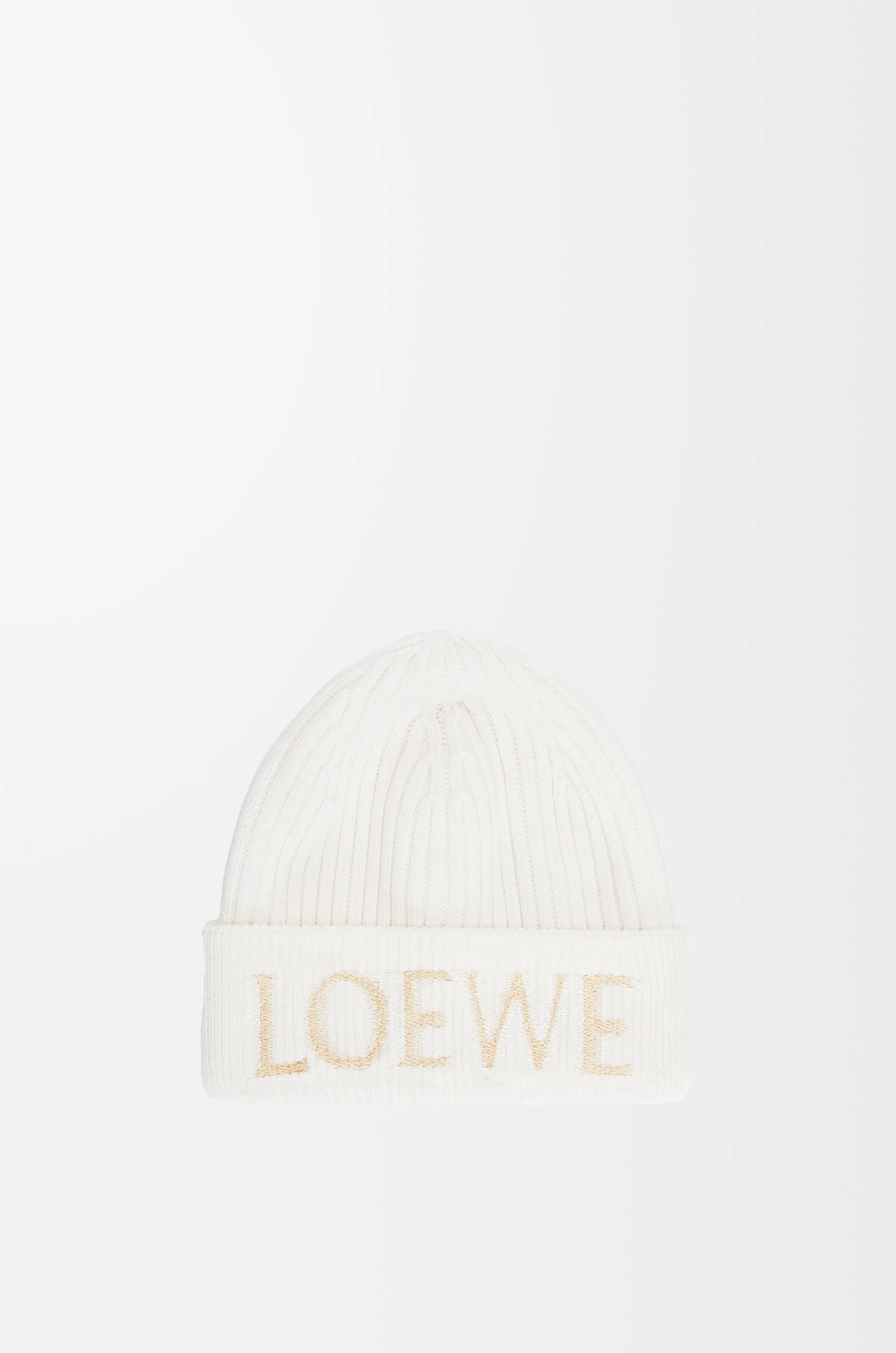 Beanie crafted in medium-weight wool knitted rib. - Turn-up cuff - Blurred LOEWE embroidery Details - Colour : White - Main material : Wool - Weight : 0.12 kg - Height (cm) : 26 - Width (cm) : 21.5 - Height (inch) : 10.2 - Width (inch) : 8.5 - Model ID : F540257X23 - CIL : - 0011082971 - Made in : Italy
