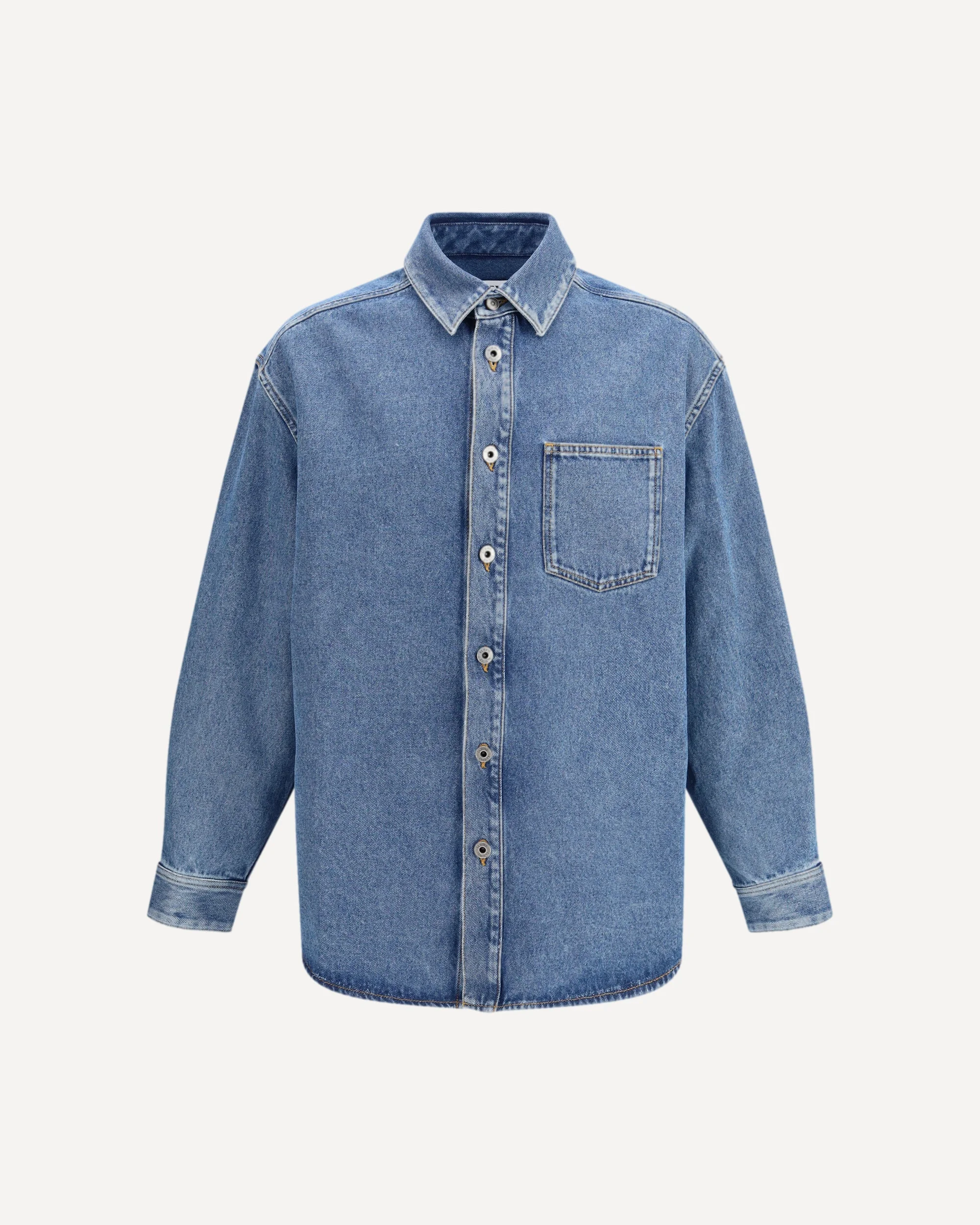 The Shirt-jacket by Loewe is crafted from medium-weight cotton denim and features a relaxed fit with a standard length, designed for an elevated yet effortless everyday wear. The classic collar and button-front closure shape its clean look, while the buttoned cuffs add definition. On the elbows, the Anagram embroidery introduces an iconic, artisanal touch that instantly distinguishes the piece. DETAILS - Sku: H526Y1DW27_5475 - Season: SS26 - Fit: Oversize - Composition: GENERAL 100% Cotton - MADE IN ITALY