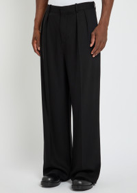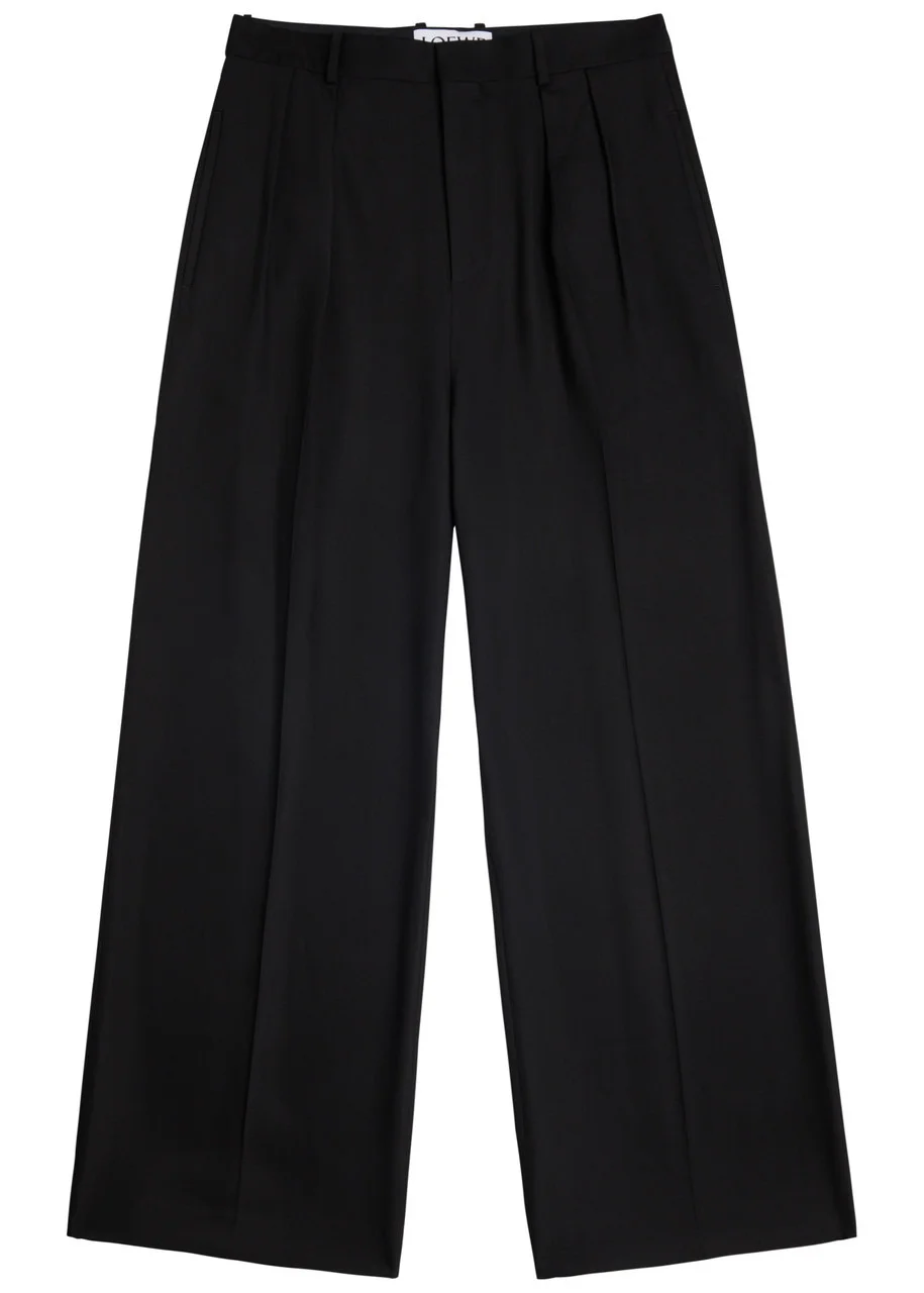 Info & Care Loewe;woven trousers Belt loops, pleats at waist, side slip pockets, dropped crotch, pressed crease through legs, logo embroidery at back, back slit pocket Concealed hook, button and zip fastening at front 96% viscose, 4%;elastane Dry clean Size & Fit Inside leg length: 29 inches/ 73.5cm Midweight Loose fit, straight-leg cut Model is 6'1"/ 185cm and wears a size IT48