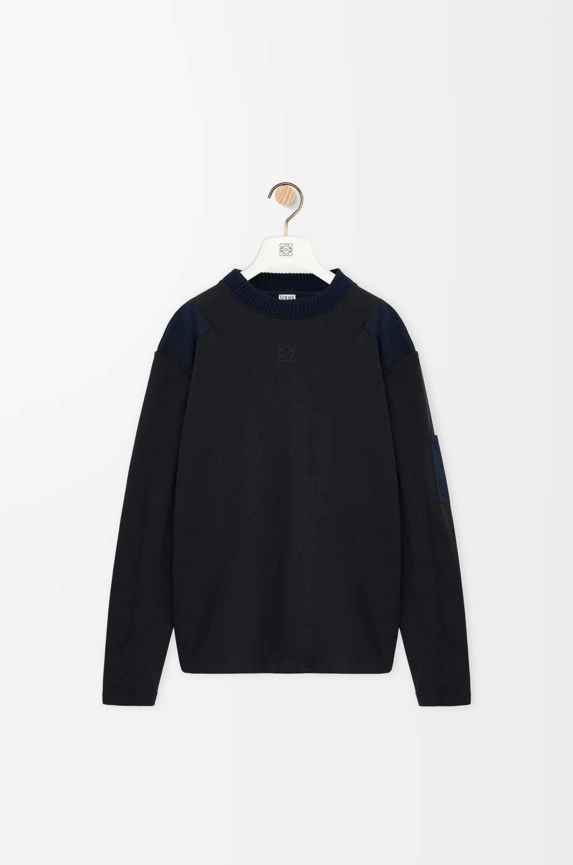 Top in medium-weight cotton blend featuring a mixed material patchwork design and a rib knit collar and back. - Regular fit, regular length - Crew neck - Snap button shoulder tabs - Patch pocket on the sleeve - Anagram embroidery placed at the front Colour: Anthracite/Dark Navy Main material: Acrylic/cotton Weight: 0.17 kg Made in: Portugal