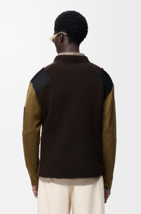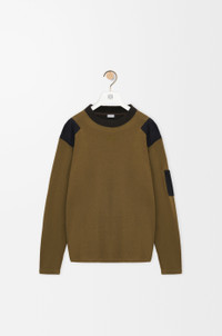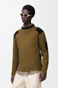 Top in medium-weight cotton blend featuring a mixed material patchwork design and a rib knit collar and back. - Regular fit, regular length - Crew neck - Snap button shoulder tabs - Patch pocket on the sleeve - Anagram embroidery placed at the front Colour: Khaki/Black Main material: Acrylic/cotton Weight: 0.17 kg Made in: Portugal Materials & care Main Material: 50% acrylic 50% cotton
