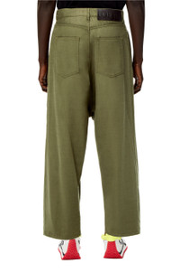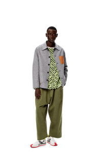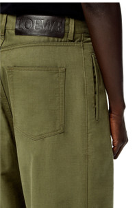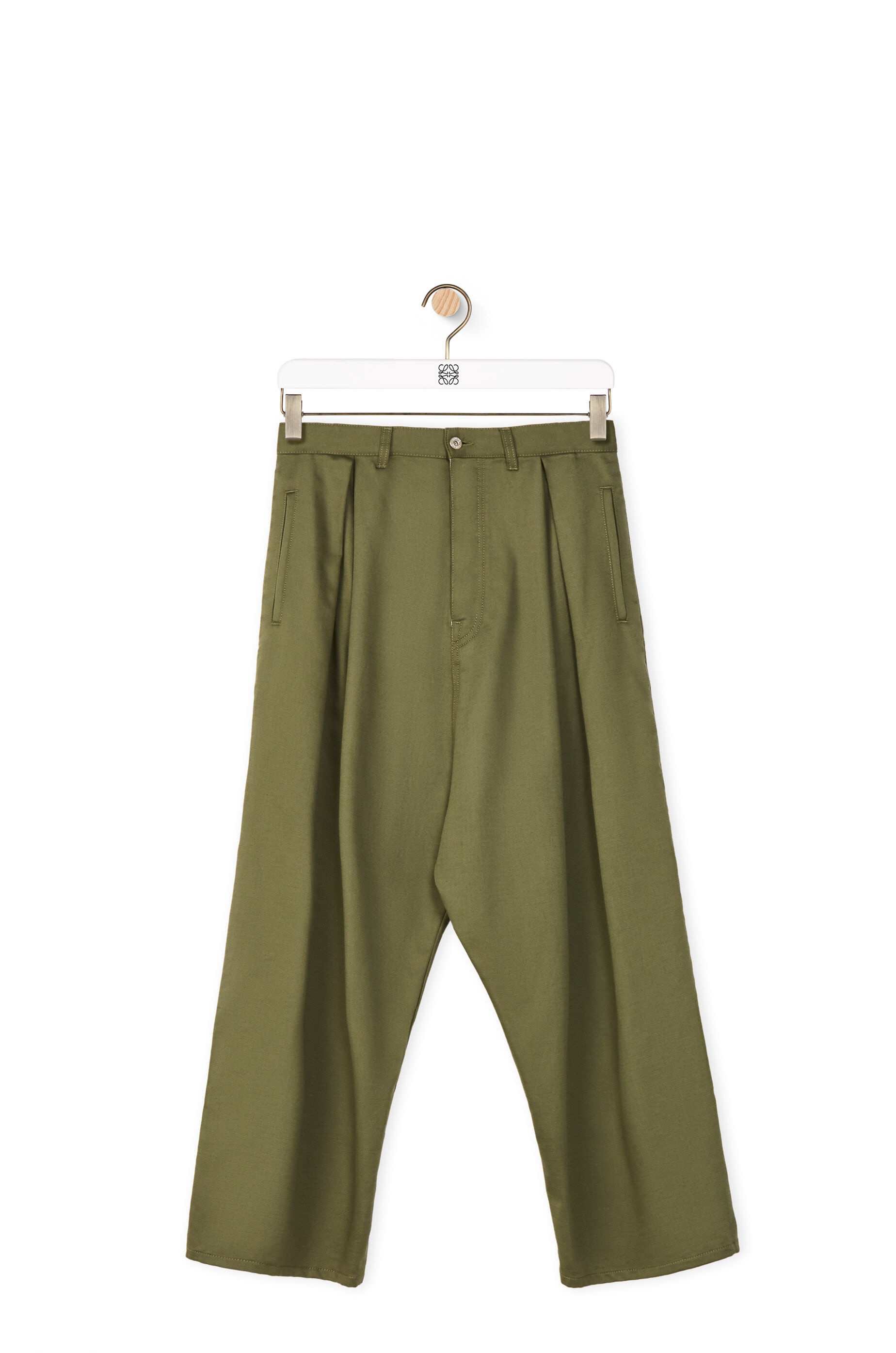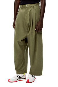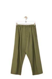 Low crotch, pleat front trousers in textured cotton with a side pocket and two rear patch pockets. - Oversize fit - Embossed LOEWE calfskin tab Details - Colour: Military Green - Main material: Cotton - Weight : 0.56 kg - Model ID: H526Y04W93 - Made in: Italy