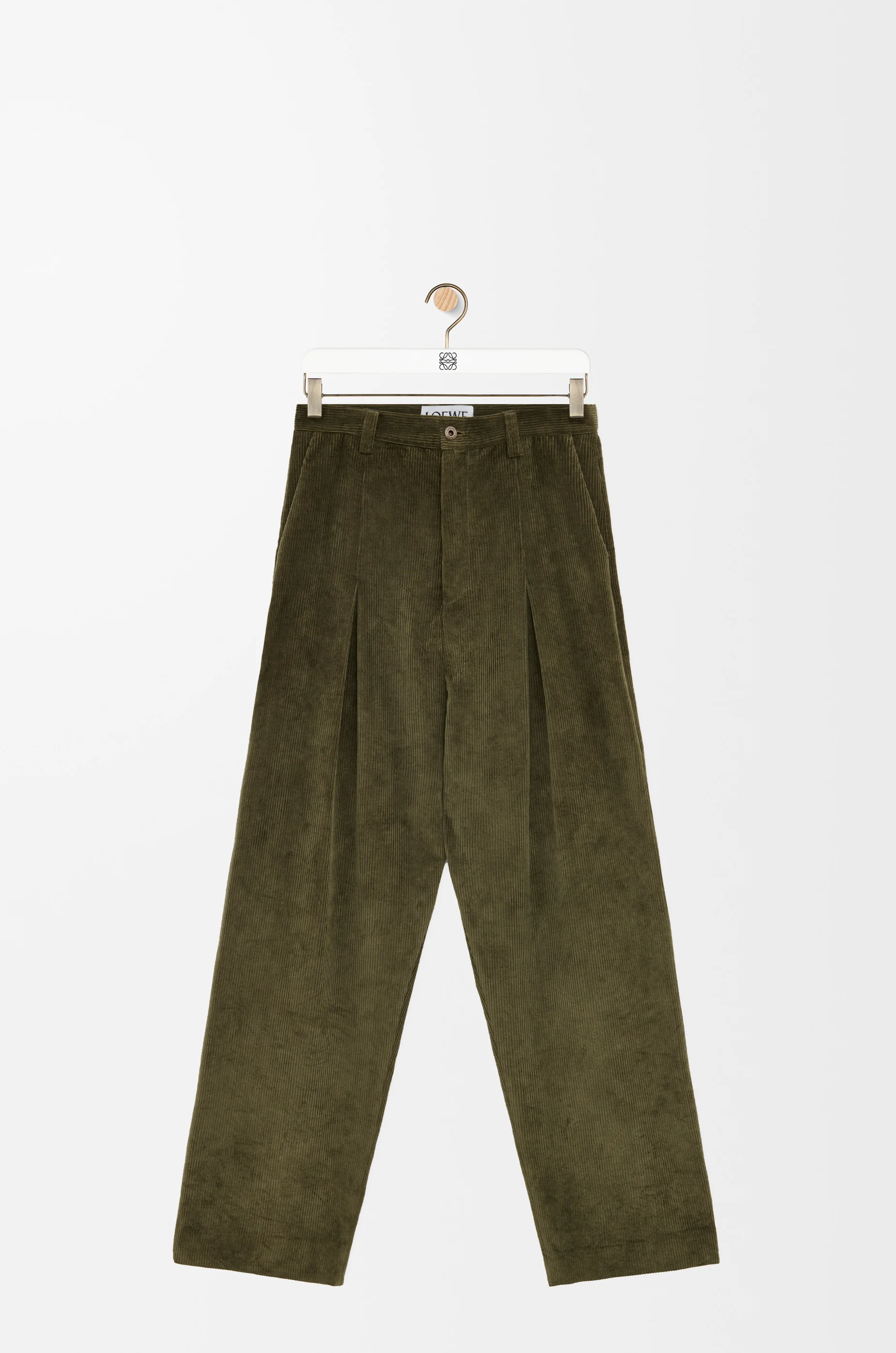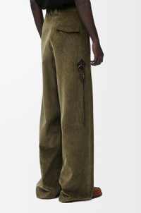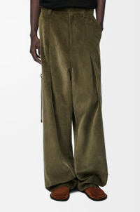 Trousers crafted in lightweight cotton and cashmere corduroy. - Relaxed fit - Long length - Mid waist - Loose leg - Low crotch silhouette - Pleats at the front - Belt loops - Concealed zip fly - Seam pockets - Rear flap pocket - LOEWE engraved buckle and leather patch detail at the back Details - Colour : Khaki Green - Main material : Cotton/Cashemere - Weight : 0.6 kg - Model ID : H526Y04WEU - Made in : Italy