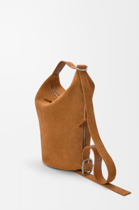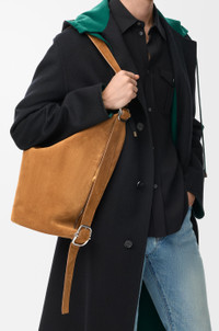 The Loop is a hybrid bag that combines the silhouette of a bucket with the effortlessness of a duffle. It can be worn in multiple ways thanks to a signature buckle and slider designed to seamlessly adjust its loop strap while a top and side zip guarantee easy access. This version is crafted in suede calfskin. - Shoulder or crossbody carry - Adjustable strap - Zip closure - Unlined - Embossed LOEWE Colour: Tobacco Metallic colour: Palladium Main material: Suede Strap length: 120 - 130 cm Strap drop: 30 - 35 cm Weight: 0.875 kg Height: 39 cm Width: 39 cm Depth: 15.5 cm Made in: Spain