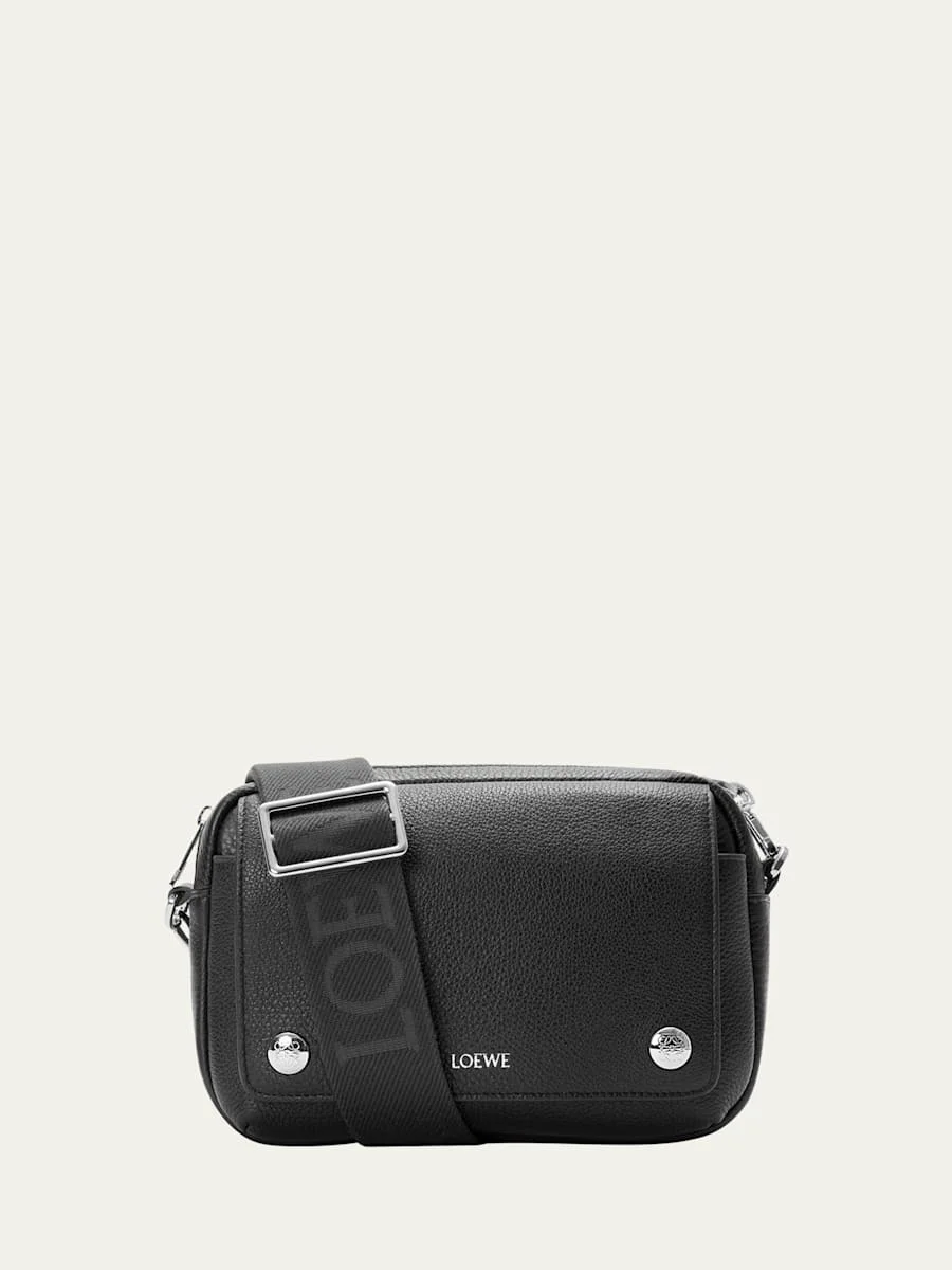 Loewe "Pebble" camera bag in grained calf leather Adjustable, detachable fabric logo strap Exterior, front pocket with magnetic closure Interior, two card slots Suede lining Zip top closure Approx. 7.8"W x 4.9"H x 2.3"D Made in Spain Online Inquiries: BGS21_NETJV| Store Inquiries: #5045730