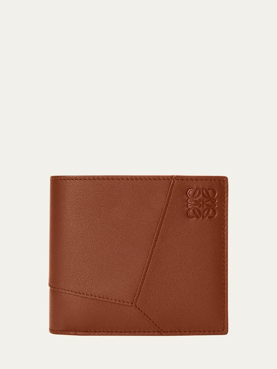 Loewe "Puzzle Edge" bifold wallet in calfskin leather with overlapped edges Inspired by the signature Puzzle bag featuring the distinctive geometric pattern Embossed Anagram Two note compartments Eight card slots Two slip pockets Calfskin lining Approx. 3.9"H x 4.3"W x 0.7"D Made in Spain