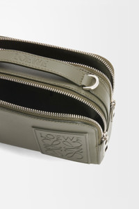 Versatile camera bag with two zipped compartments. This version is crafted in satin calfskin. - Crossbody or hand carry - Adjustable and detachable LOEWE webbing strap - Herringbone cotton canvas lining - Debossed LOEWE Anagram patch Colour: Khaki Green Metallic colour: Palladium Main material: Satin Calf Strap length: 75 - 128 cm Strap drop: 37 - 63 cm Weight: 0.33 kg Height: 13 cm Width: 18 cm Depth: 8.5 cm Made in: Portugal