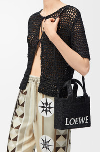 The LOEWE Font tote is a cuboid bag with a contrasting LOEWE signature. It is made in Spain using raffia palm leaves cultivated and handwoven by artisans in Madagascar. - Shoulder, crossbody or hand carry - Detachable and adjustable strap - Unlined Colour: Black Metallic colour: Gold Main material: Raffia Strap length: 107 - 117 cm Strap drop: 50 - 55 cm Handle drop: 13 cm Weight: 0.29 kg Height: 16 cm Width: 19 cm Depth: 6.5 cm
