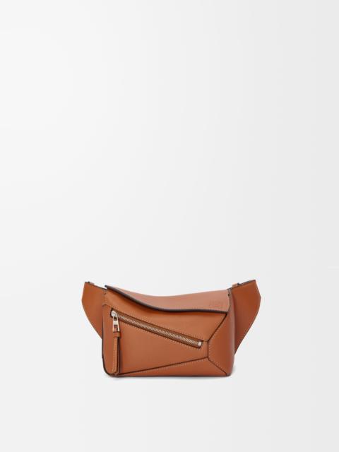 The Puzzle Edge is defined by its distinctive geometric lines and its cuboid form. It differs to the classic construction in its overlapped panels with single stitch lines. This mini bumbag version is crafted in classic calfskin. - Shoulder or crossbody carry - Adjustable strap featuring metal clasp closure with engraved LOEWE - Zip closure with calfskin zip pull - One external zip pocket - Herringbone cotton canvas lining - Embossed Anagram Colour: Black Metallic colour: Palladium Main material: Classic Calf Strap length: 80 - 136 cm Strap drop: 36 - 65 cm Weight: 0.3 kg Height: 11.8 cm Width: 17.5 cm Depth: 7.5 cm Made in: Spain