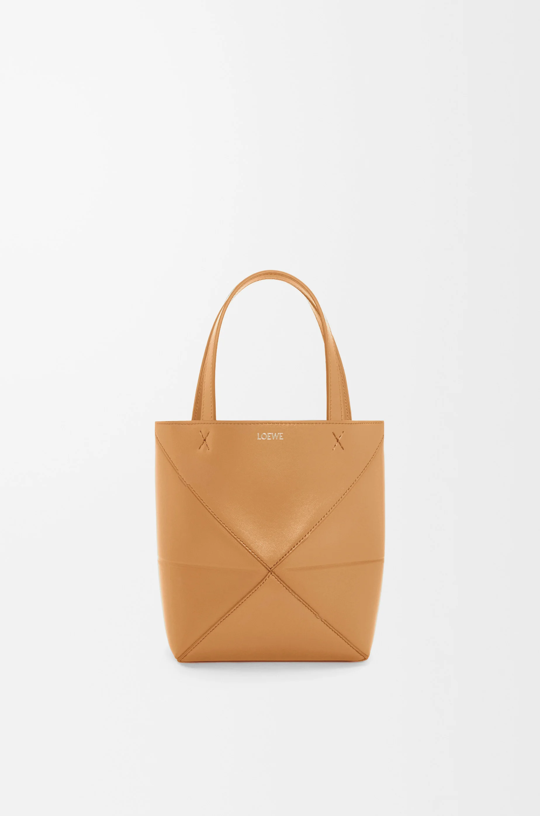 The Puzzle Fold's lightweight geometric structure is designed to fold completely flat, making it a perfect tote to travel with. This mini version is crafted in shiny calfskin. - Shoulder, crossbody or hand carry - Detachable and adjustable strap - Suede lining - Gold or silver embossed LOEWE Colour: Warm Desert Metallic colour: Gold Main material: Shiny Calf Strap length: 99 - 114 cm Strap drop: 48 - 55 cm Handle drop: 14 cm Weight: 0.2 kg Height: 20 cm Width: 16.5 cm Depth: 9.5 cm Made in: Spain