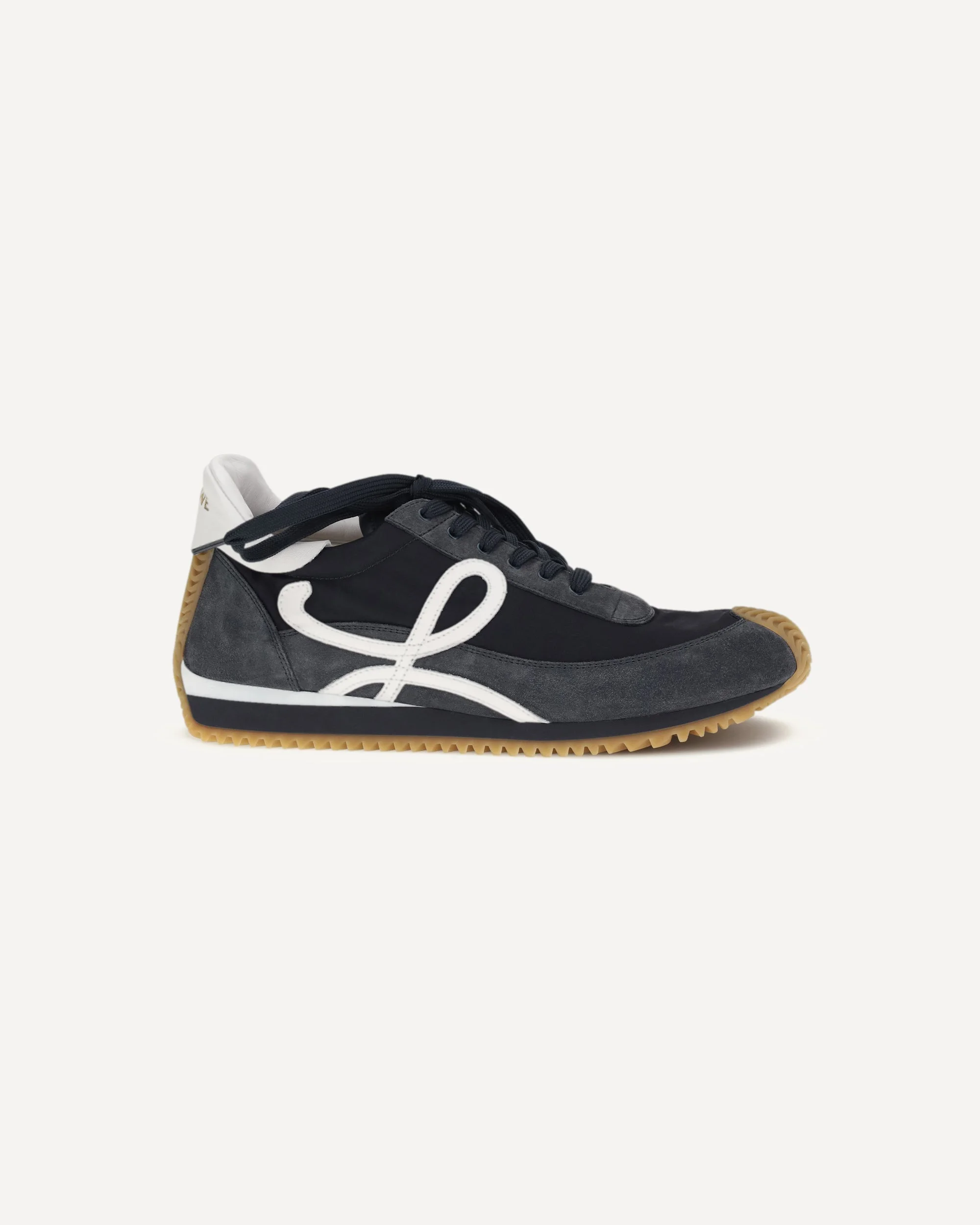 The nylon and suede Flow Runner Sneakers by Loewe combine dynamic and sophisticated design. The soft upper, which mixes nylon and suede, is complemented by a honey-colored rubber wavy sole that curves elegantly at the toe and back of the heel for a unique effect. The gold LOEWE logo and embossed Anagram motif on the tongue add a touch of understated luxury, while the L monogram on the side recalls the brand's distinctive identity. A model that combines comfort, style, and impeccable quality. DETAILS - Sku: MLSR282X03_9602 - Season: SS26 - Composition: UPPER 50% Calf Leather Bos Taurus 50% Nylon SOLE 100% Rubber - MADE IN ITALY