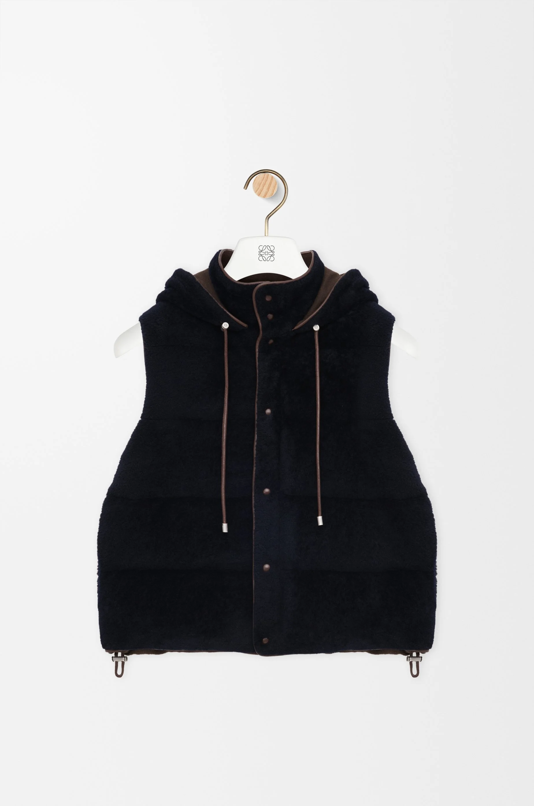 Vest in medium-weight Merino shearling featuring a padded construction and contrast leather piping. - Regular fit, regular length - Hooded collar - Snap button front fastening - Seam pockets - Adjustable drawstring hem - LOEWE Anagram embossed leather patch placed on the hood Colour: Brown/Navy Blue Main material: Shearling Weight: 0.95 kg Made in: Spain
