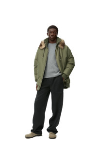 Coat in lightweight water-repellent technical cotton shell featuring a padded construction and a removable shearling hood with a leather drawstring. - Relaxed fit, long length - High neck - Rib knit collar and cuffs, concealed rib knit hem - Zip front fastening - Seam pockets, inside LOEWE Anagram embroidered welt pocket - LOEWE Anagram embossed leather patch placed on the hood Details - Colour : Khaki Green - Main material : Cotton/Polyamide - Weight : 2.0 kg - Model ID : H526Y02WAA - Made in : Italy