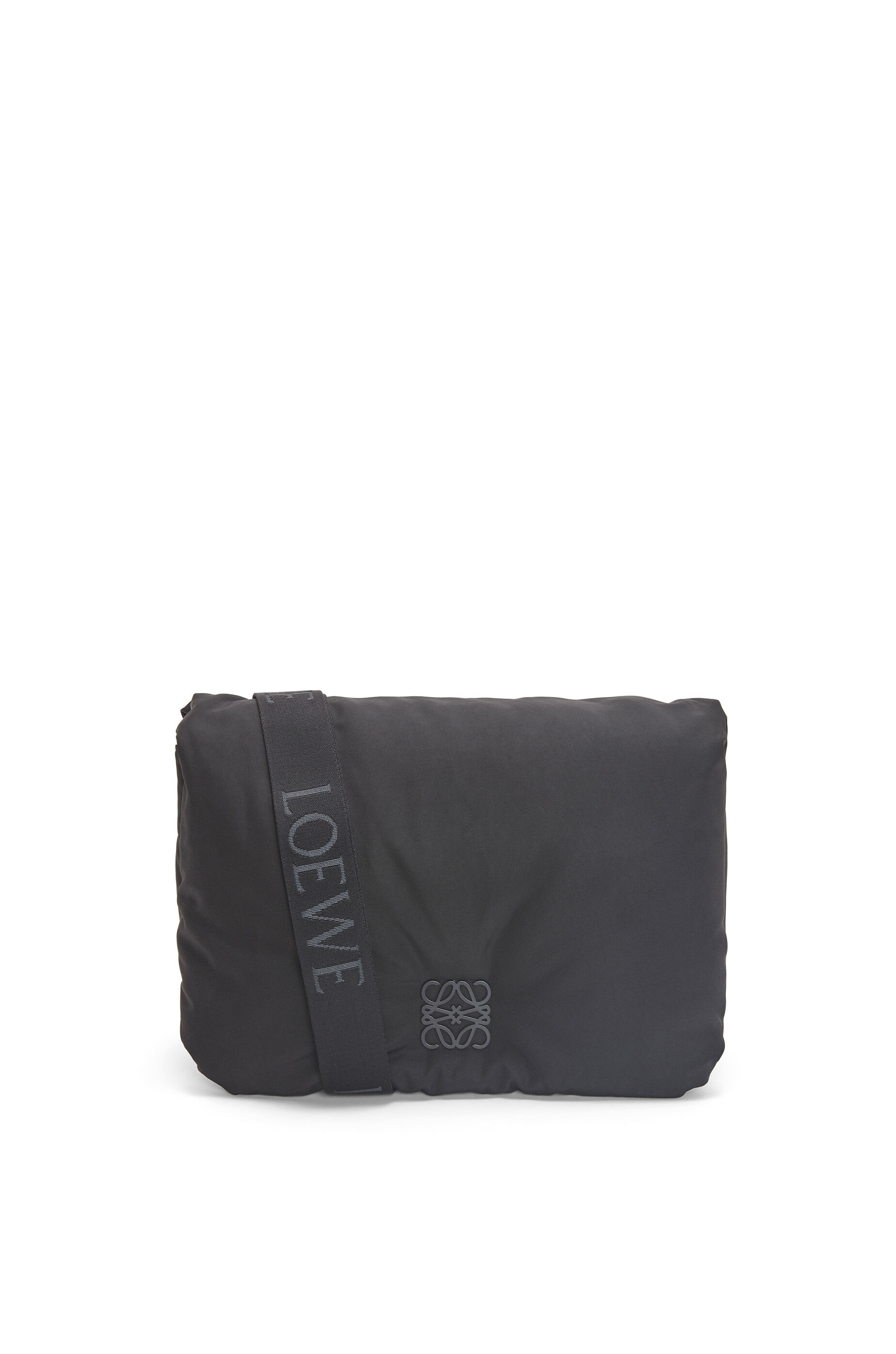 Inspired by the Goya aesthetic and key details, the Goya Puffer is bringing a new sensorial and tactile dimension, emphasised by goose feather padding. This Messenger version is crafted in nylon and has a LOEWE webbing strap. - Shoulder or crossbody carry - Adjustable and detachable strap - Anagram magnetic closure - Internal zip pocket - Contrast nappa lining - Embossed Anagram Details - Colour: Black - Metallic colour: Palladium - Main material: Nylon/Calf - Strap length: 77 - 132 cm - Weight: 0.7 kg - Height (cm): 20.5 - Width (cm): 30 - Depth (cm): 10 - Height (inch): 8.1 - Width (inch): 11.8 - Depth (inch): 3.9 - Model ID: B896G22X01 - CIL: 0010825792 - Made in: Spain