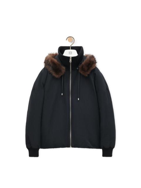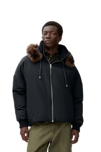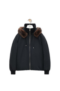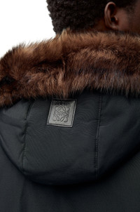 Jacket in lightweight water-repellent technical cotton shell featuring a padded construction, a removable shearling hood with a leather drawstring. - Relaxed fit, regular length - High neck - Rib knit collar and cuffs, concealed rib knit hem - Zip front fastening - Seam pockets, inside LOEWE Anagram embroidered welt pocket - LOEWE Anagram embossed leather patch placed on the hood Details - Colour : Black - Main material : Cotton/Polyamide - Weight : 1.8 kg - Model ID : H526Y02WAB - Made in : Italy