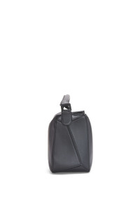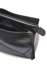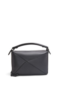 The Puzzle bag is the debut bag for LOEWE by Creative Director Jonathan Anderson. A cuboid shape and precise cutting technique create Puzzle’s distinctive geometric lines. This version is crafted in satin calfskin with tonal hardware and comes with a detachable strap embossed with LOEWE. - Shoulder, crossbody or top handle carry - Detachable and adjustable shoulder strap - Zip closure with calfskin pull - Exterior flat pocket and a double internal slip pocket - Customisable with strap and personalisation charms - Tonal herringbone cotton canvas lining - Embossed Anagram Details - Colour: Black - Metallic colour: Palladium - Main material: Satin Calf - Strap length: 79.5 - 119.5 cm - Handle drop: 9 cm - Weight: 0.75 kg - Height (cm): 19.5 - Width (cm): 29 - Depth (cm): 14 - Height (inch): 7.7 - Width (inch): 11.4 - Depth (inch): 5.5 - Model ID: B510S20X03 - CIL: 0010825149 - Made in: Spain