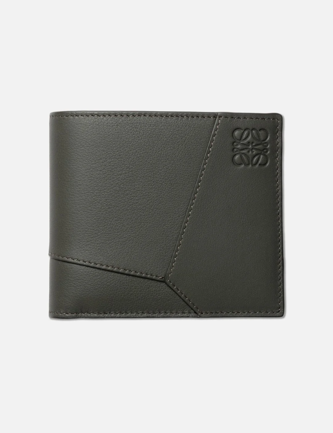 - Loewe - Puzzle Bifold Wallet - Made of classic calfskin - Puzzle bifold wallet - Geometric pattern - Embossed anagram - Eight card slots - Two large note pockets - Two flat pockets - Calfskin lining - Made in Spain - Color: Dark Khaki - Material: Calfskin - See more Wallets and Accessories - Width: 11cm / 21cm (Open) - Length: 9.5cm - Vendor Code: C510302X16