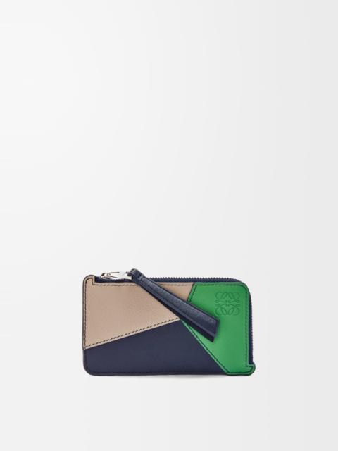Coin cardholder inspired by the Puzzle bag's distinctive geometric pattern. This version is crafted in classic calfskin in contrasting colours. - Four card slots - One zipped coin compartment with calfskin pull - Calfskin lining - Embossed Anagram Colour: Asphalt Grey/Storm Blue Metallic colour: Palladium Main material: Classic calf Weight: 0.04 kg Height: 7.5 cm Width: 13 cm Depth: 1 cm Made in: Spain