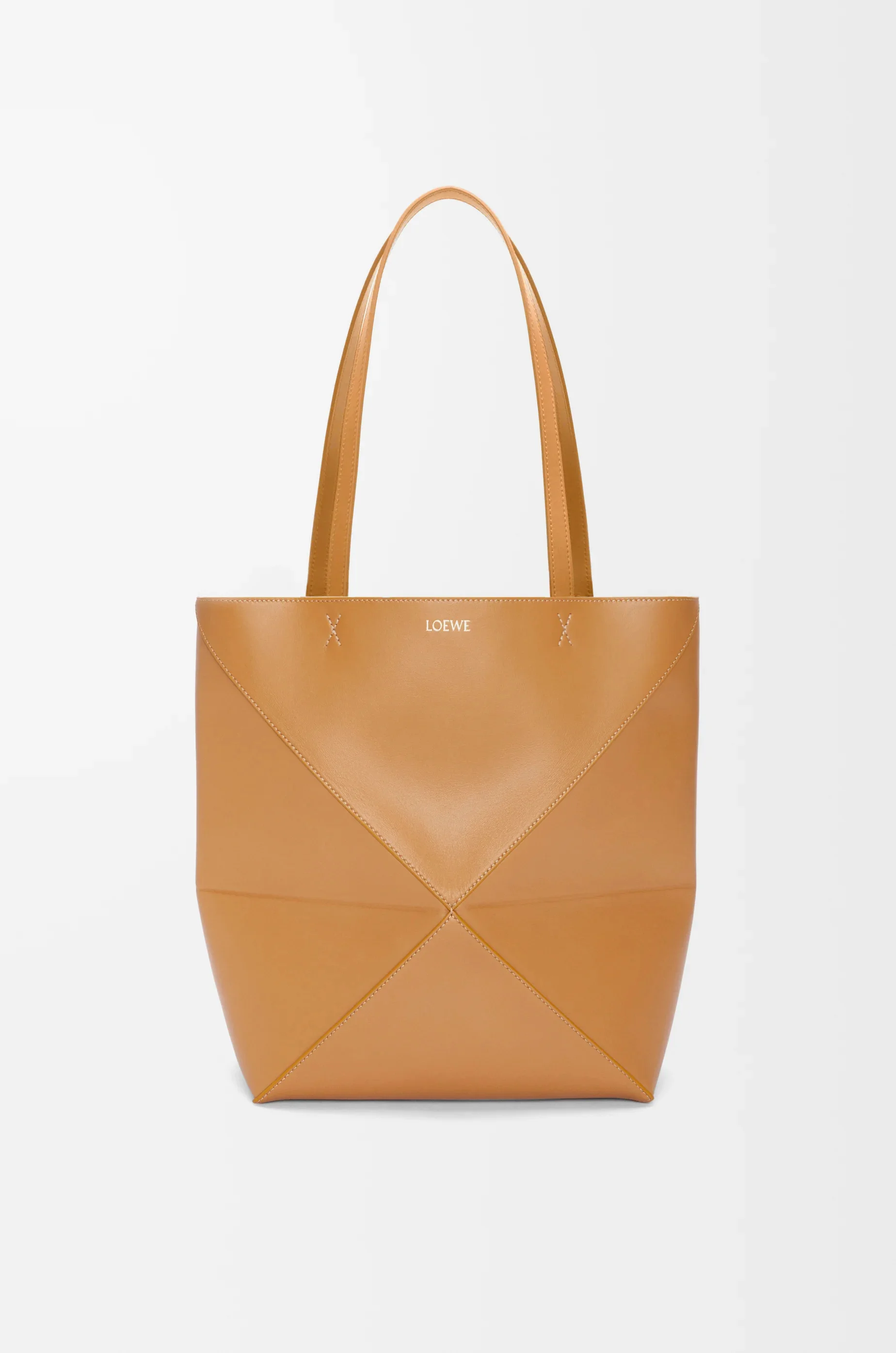 The Puzzle Fold's lightweight geometric structure is designed to fold completely flat, making it a perfect tote to travel with. This medium version is crafted in shiny calfskin. - Shoulder or hand carry - Suede lining - Gold or silver embossed LOEWE Colour: Warm Desert Main material: Shiny Calf Handle drop: 27 cm Weight: 0.43 kg Height: 31.5 cm Width: 25.5 cm Depth: 14.5 cm Made in: Spain