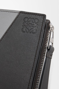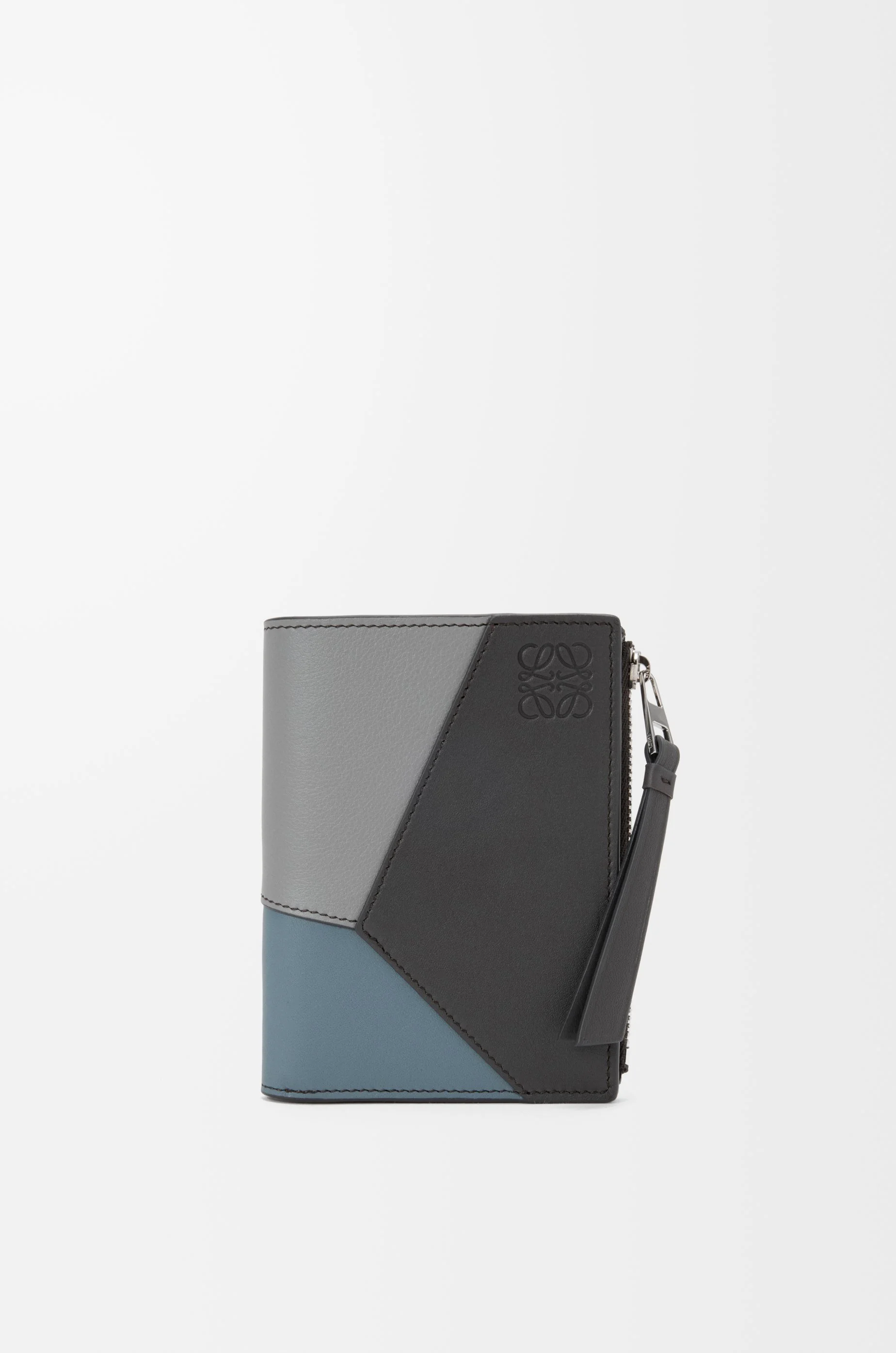 Slim compact wallet inspired by the Puzzle bag's distinctive geometric pattern. This version is crafted in classic calfskin in contrasting colours. - Six card slots, four slip pockets, one large note pocket - One zipped coin compartment with calfskin pull - Snap button closure - Calfskin lining - Embossed Anagram Colour: Asphalt Grey/Storm Blue Metallic colour: Palladium Main material: Classic calf Weight: 0.07 kg Height: 11.8 cm Width: 9.3 cm Depth: 1 cm Made in: Spain