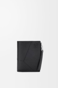 Slim compact wallet inspired by the Puzzle bag's distinctive geometric pattern. This version is crafted in supple grained calfskin. - Six card slots, four slip pockets, one large note pocket - One zipped coin compartment with calfskin pull - Snap button closure - Calfskin lining - Embossed Anagram Colour: Black Metallic colour: Palladium Main material: Supple Grained Calf Weight: 0.078 kg Height: 11.8 cm Width: 9.3 cm Depth: 1 cm Made in: Spain
