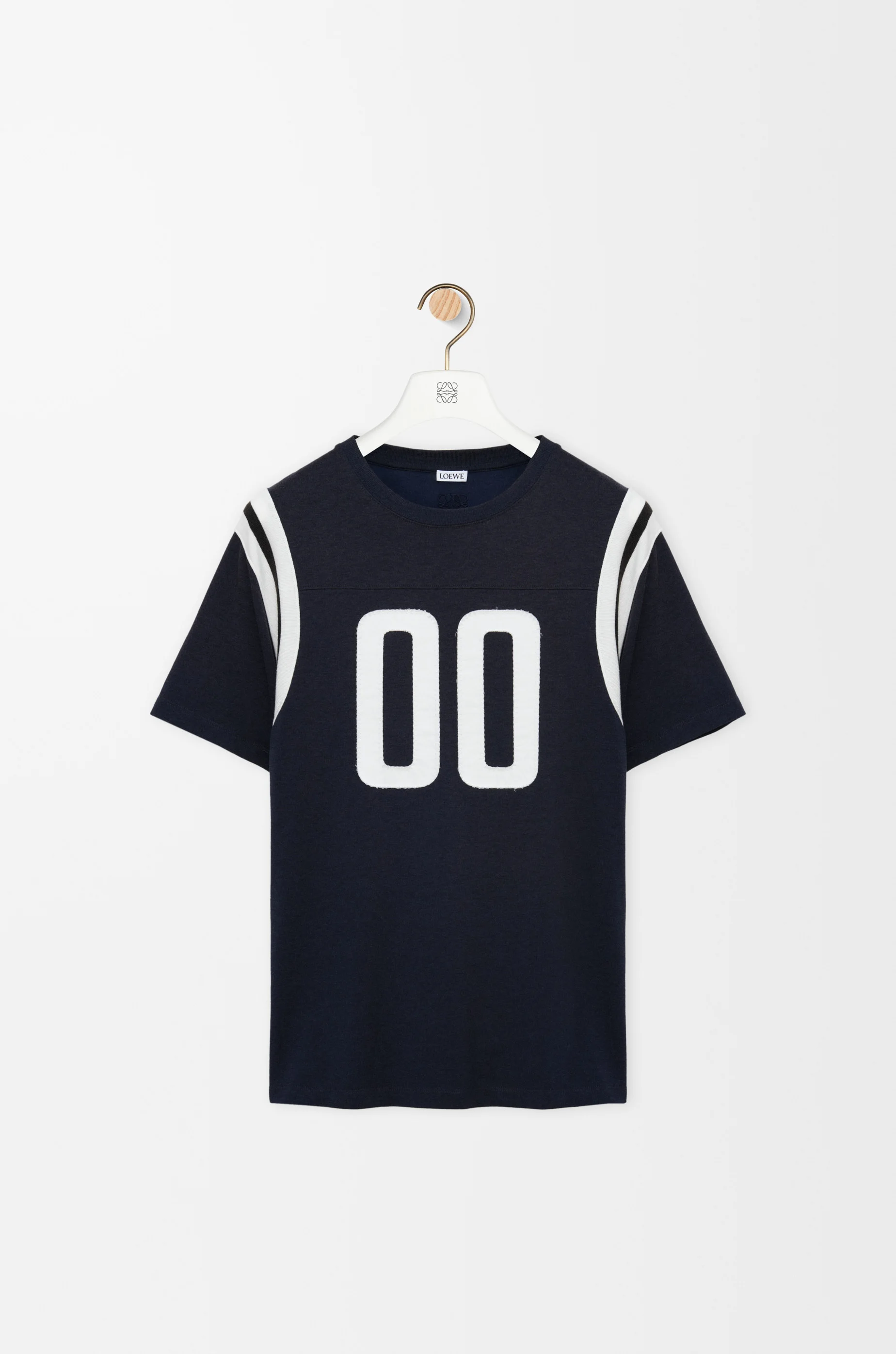 T-shirt in lightweight mercerised cotton featuring stitched numbers at the front and striped knit armholes. - Regular fit, regular length - Crew neck - Anagram embroidery placed at the back Colour: Dark Navy Main material: Cotton/Viscose Weight: 0.2 kg Made in: Portugal Materials & care Main Material: 76% cotton 24% viscose