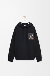 Hoodie in medium-weight loopback cotton fleece featuring a Futurist Cat intarsia on the leather chest patch pocket. This hoodie is inspired by Louis Wain's "Futurist Cats" porcelain vase series. - Relaxed fit, regular length - Hooded collar - Ribbed cuffs and hem - Embossed Anagram on the chest pocket Colour: Black Main material: Cotton Weight: 0.92 kg Made in: Portugal Materials & care Main Material: 100% cotton