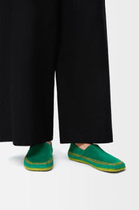 Slipper in suede featuring a hand-crafted raffia embroidery and a signature petal toe shape. - 5mm heel - Anagram Pebble at the side - Extra-padded insole - Anagram-embossed rubber outsole - Suede bonding Colour: Green Main material: Suede/Raffia Weight: 0.4 kg Made in: Spain