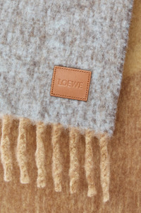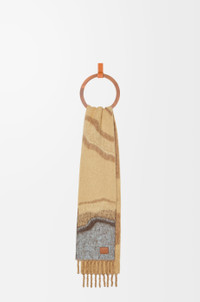 Scarf crafted in double face alpaca and wool blend. - 23cm x 185cm - Multitone jacquard marble pattern - Chunky frindged edges - LOEWE leather patch placed on the corner Details - Colour : Camel/Multicolor - Main material : Alpaca/Mohair - Weight : 0.26 kg - Height (cm) : 190 - Width (cm) : 23 - Height (inch) : 74.8 - Width (inch) : 9.1 - Model ID : F655SS1X02 - CIL : - 0011235959 - Made in : Italy