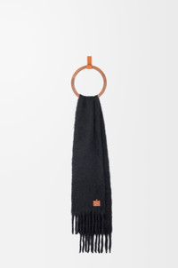Scarf in medium-weight mohair and wool blend featuring a Futurist cat enamel and brass pin. This scarf is inspired by Louis Wain's "Futurist Cats" porcelain vase series. - 23cm x 185cm - Fringed edges - LOEWE embossed leather patch placed on the corner Colour: Black Main material: Mohair/wool/polyamide Weight: 0.225 kg Made in: Spain