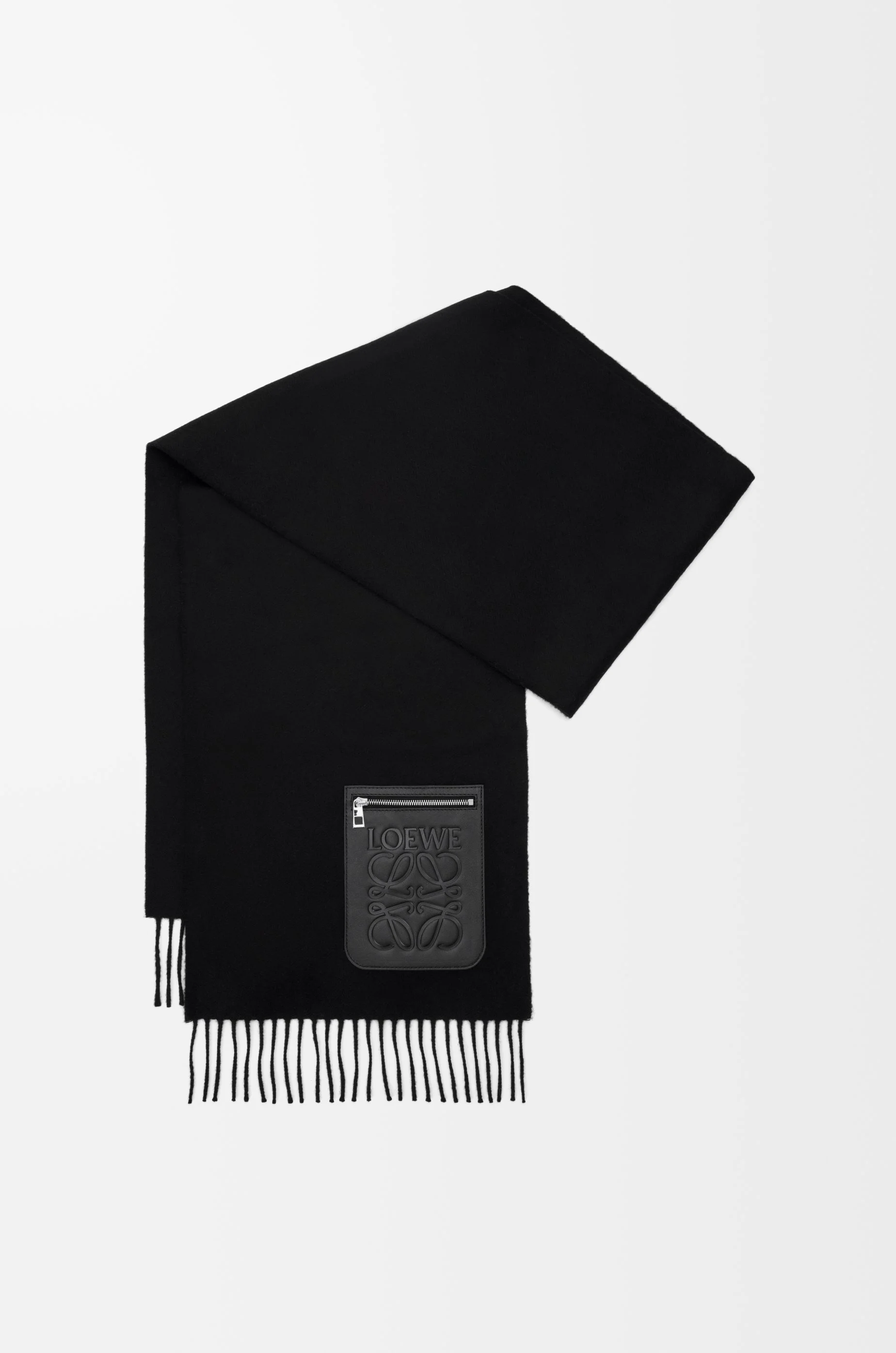Scarf in lightweight wool cashmere featuring an Anagram embossed zipped leather patch pocket. - 28cm x 180cm - Fringed edges Colour: Black Main material: Wool/Cashmere Weight: 0.175 kg Height: 180 cm Width: 28 cm Made in: United Kingdom