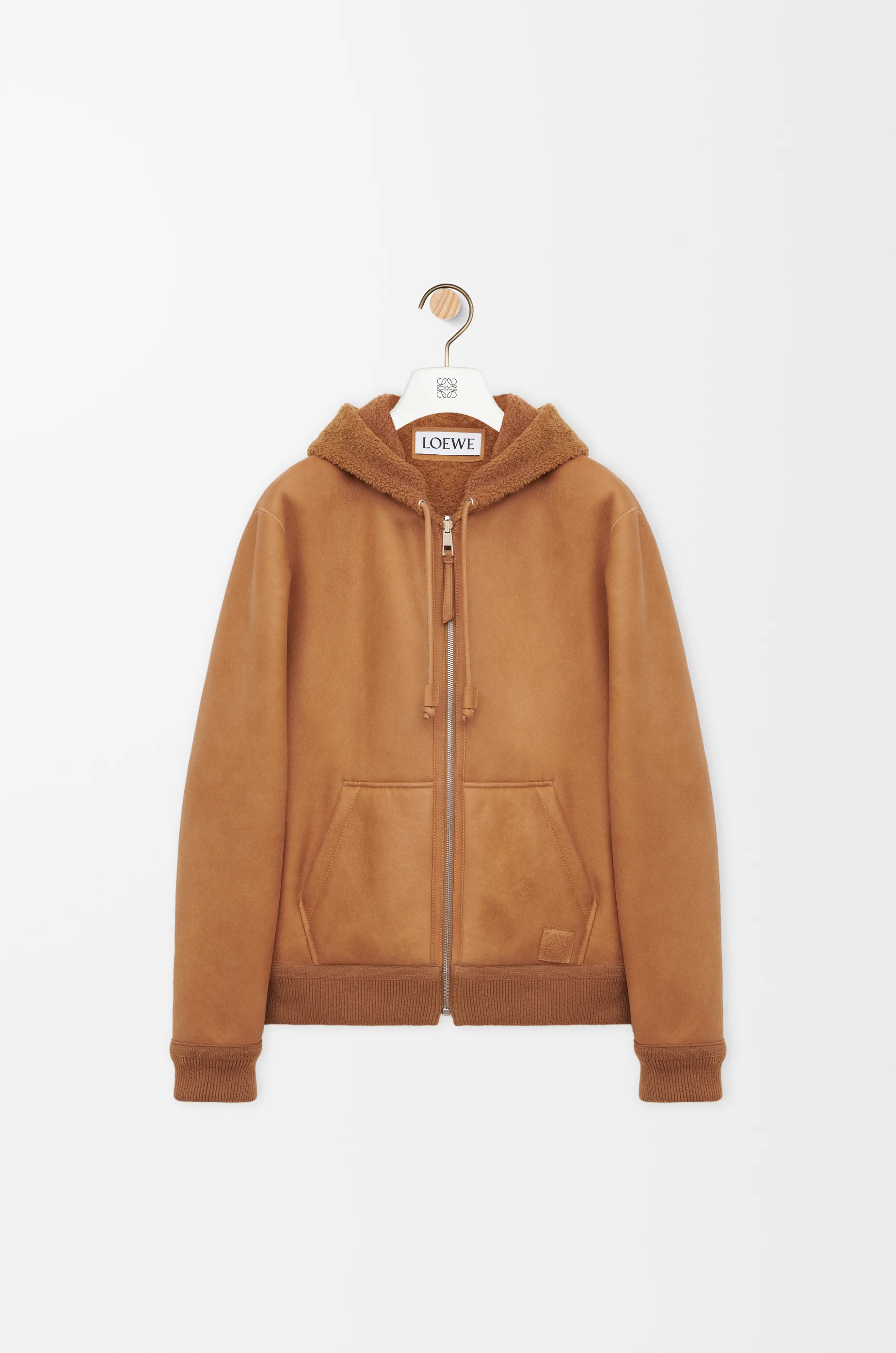 Jacket in medium-weight shaved Merino shearling featuring a reversible construction. - Relaxed fit, regular length - Hooded collar - Zip front fastening with Puzzle puller - Kangaroo pockets - Rib knit cuffs and hem - LOEWE Anagram embossed leather patch placed on the front pocket, LOEWE embossed leather patch placed on the drawstring Colour: Tan Main material: Shearling Weight: 1.3 kg Made in: Italy