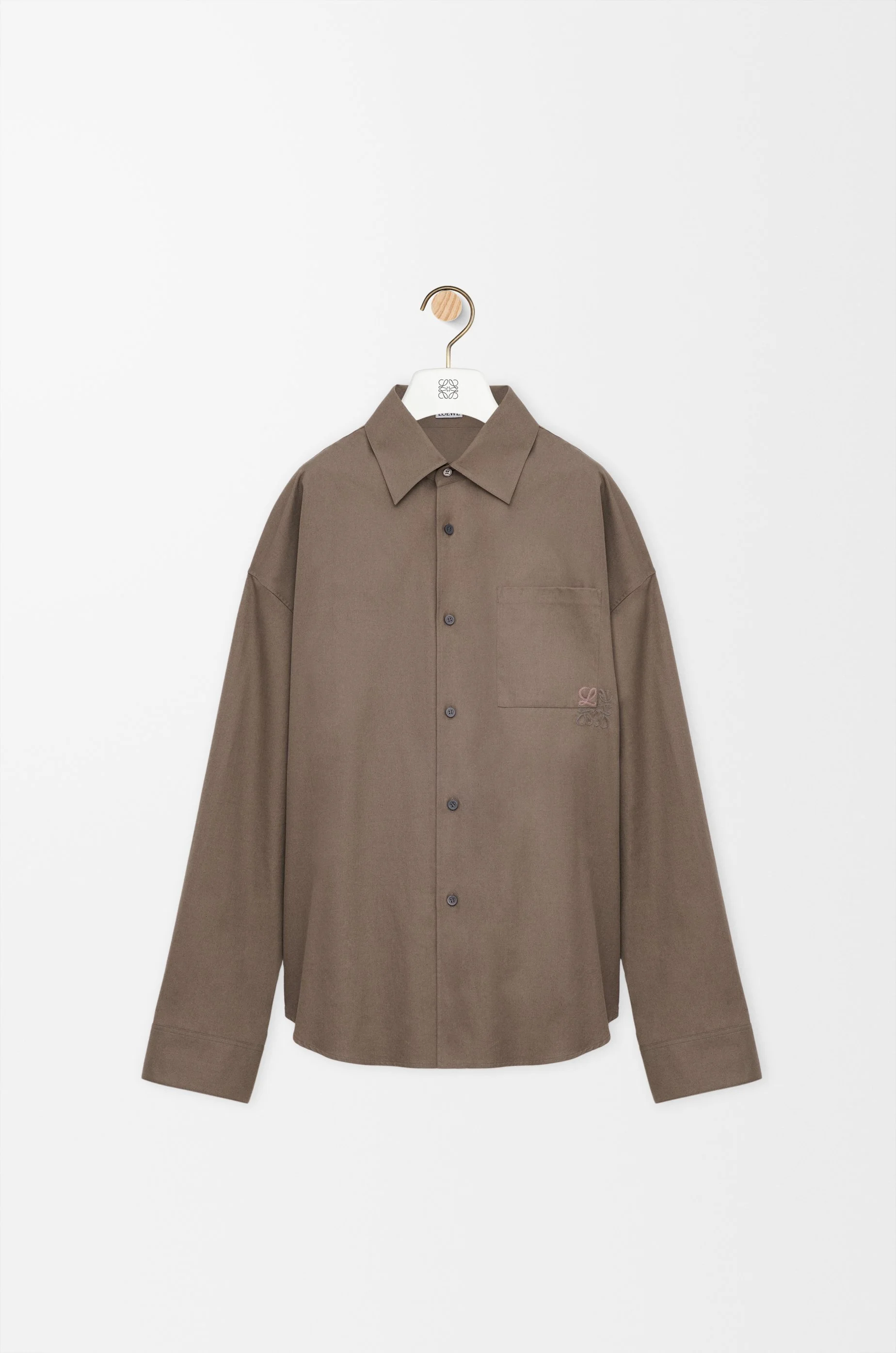 Shirt in medium-weight cotton twill. - Regular fit, regular length - Classic collar - Button front fastening, buttoned cuffs - Chest patch pocket - Two-tone Anagram embroidery placed on the chest Colour: Khaki Brown Main material: Cotton Weight: 0.41 kg Made in: Italy Materials & care Main Material: 100% cotton