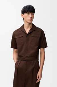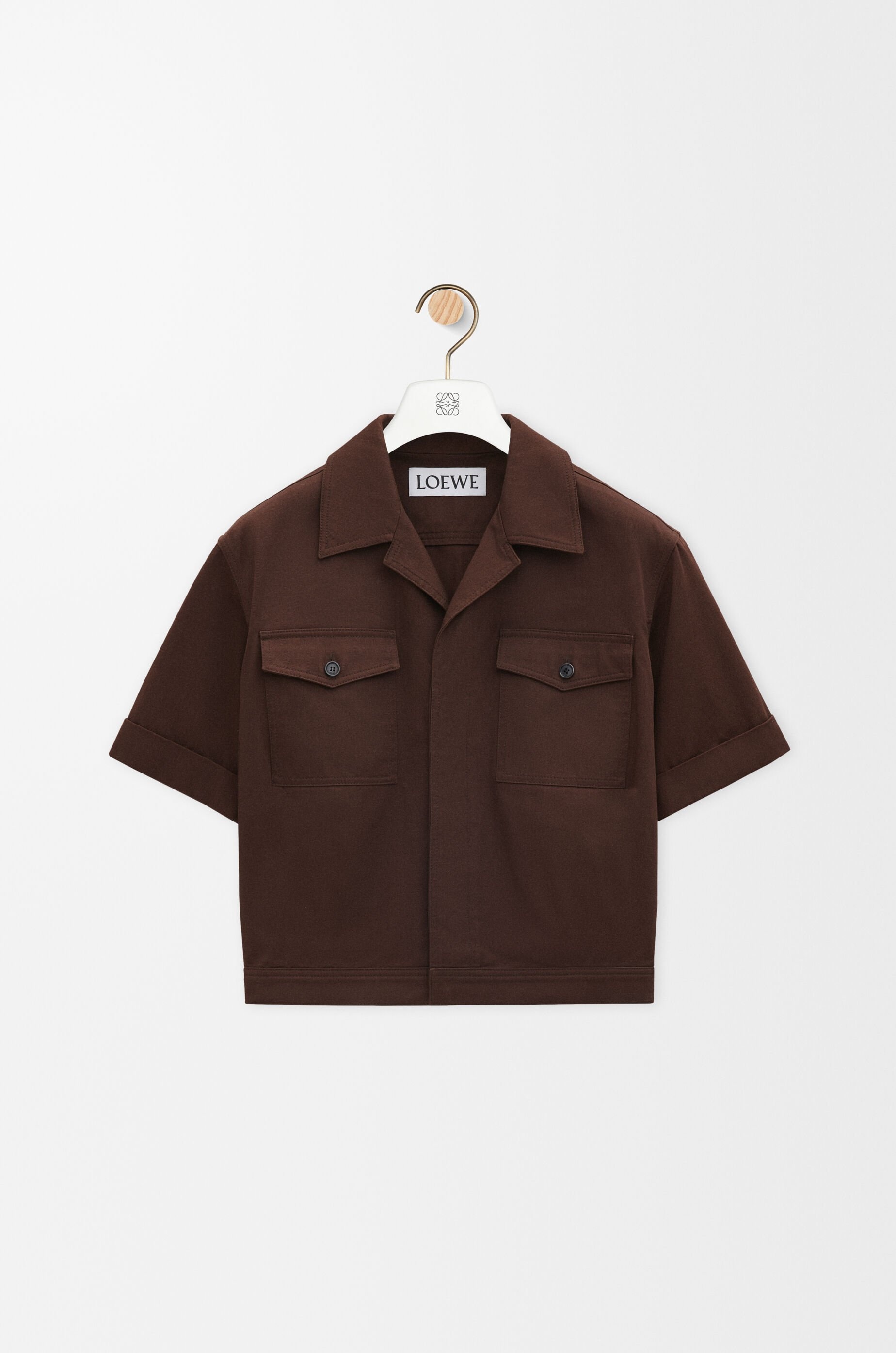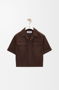 Shirt in lightweight compact cotton. - Regular fit, short length - Camp collar - Button front fastening - Cuffed sleeves - Buttoned chest patch pockets - LOEWE Anagram embossed leather patch placed at the back Details - Colour : Chocolate Brown - Main material : Cotton - Weight : 0.3 kg - Model ID : H526Y05WCV - Made in : Italy
