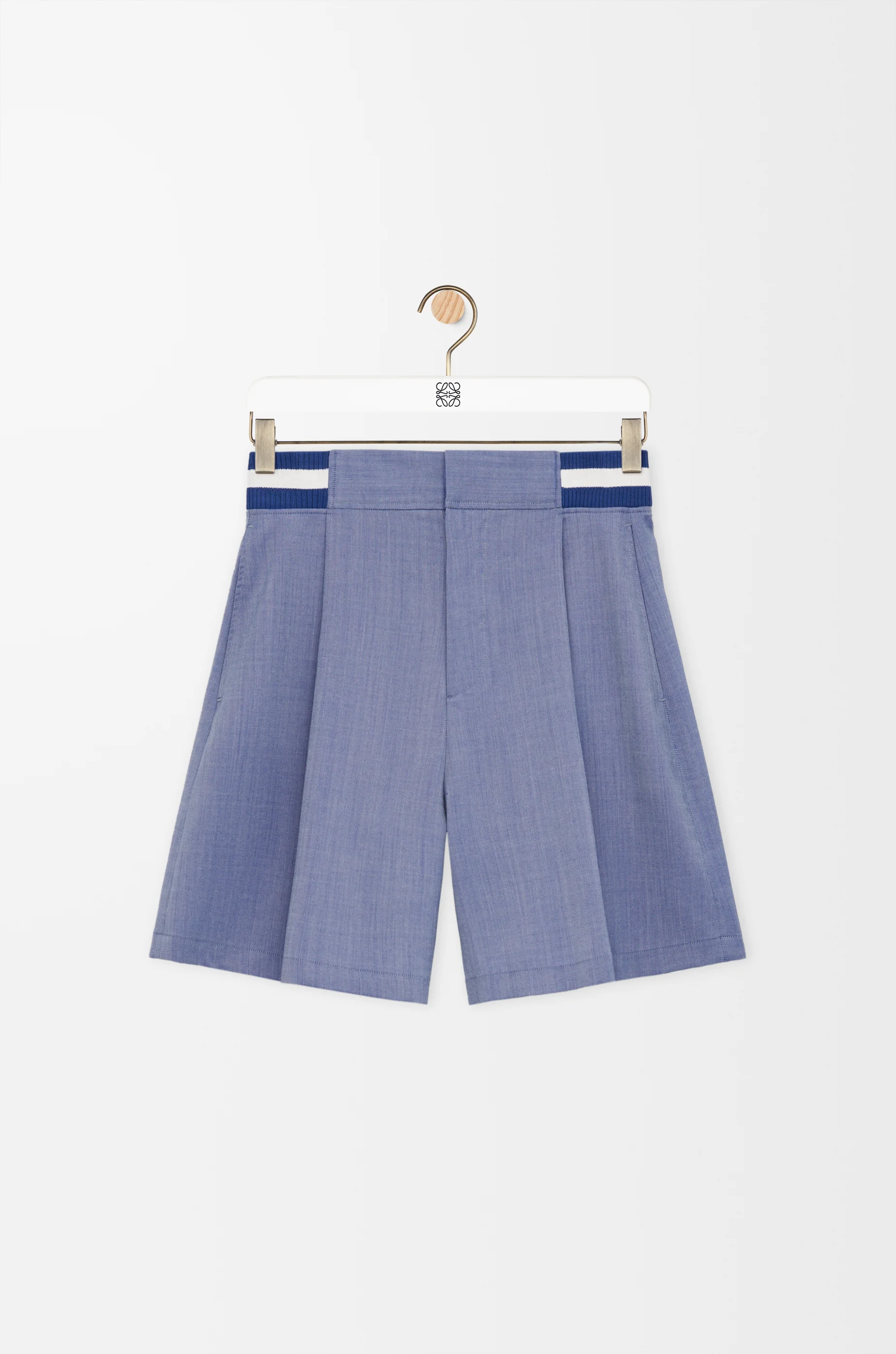 Shorts in lightweight wool oxford featuring an elasticated two-tone rib knit waistband and pleats at the front. - Relaxed fit, regular length - Concealed button fly - Slash pockets, rear welt pocket - LOEWE L embroidery placed at the back Colour: Blue Main material: Wool Weight: 0.28 kg Made in: Italy Materials & care Main Material: 100% wool