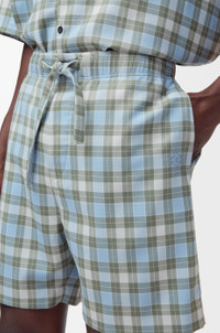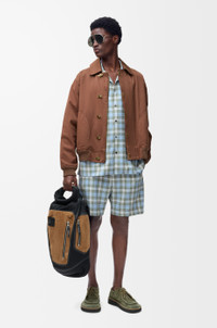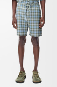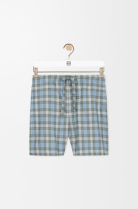 Shorts in lightweight wool blend tartan check. - Regular fit, regular length - Mid waist - Elasticated waist with drawstring - Concealed button fly - Slash pockets, rear patch pocket - Anagram embroidery placed at the front, LOEWE embossed leather patch placed at the back Colour: Light Blue/White Main material: Polyester/Wool Weight: 0.4 kg Made in: Italy Materials & care Main Material: 55% polyester 45% wool