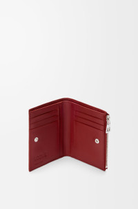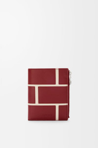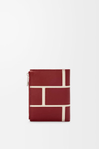 Slim compact wallet in classic calfskin with a printed brick pattern and stitched outlines. - Six card slots, four slip pockets, one large note pocket - One zipped coin compartment with calfskin pull - Snap button closure - Calfskin lining - Embossed LOEWE Colour: Burnt Red Metallic colour: Palladium Main material: Classic Calf Weight: 0.08 kg Height: 11.8 cm Width: 9.3 cm Depth: 1 cm Made in: Spain