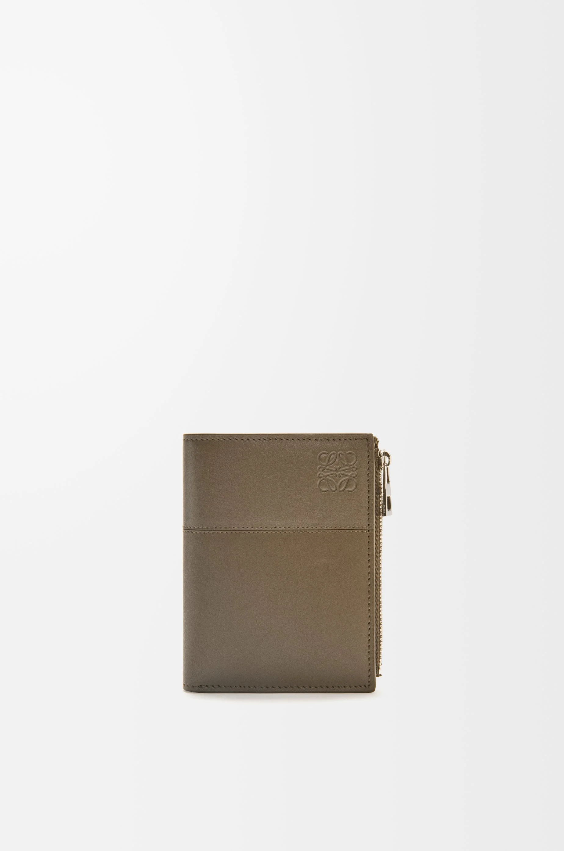 Slim compact wallet in bicolour shiny calfskin. - Zip coin compartment - Calfskin zip pull - Snap button closure - Six card slots, four slip pockets and larger pocket for notes - Calfskin lining - Embossed Anagram Details - Colour: Dark Khaki Green/Khaki Green - Metallic colour: Palladium - Main material: Shiny Calf - Weight: 0.08 kg - Height (cm): 11.8 - Width (cm): 9.3 - Depth (cm): 1 - Height (inch): 4.6 - Width (inch): 3.7 - Depth (inch): 0.4 - Model ID: C568W73X01 - CIL: 0010968980 - Made in: Spain