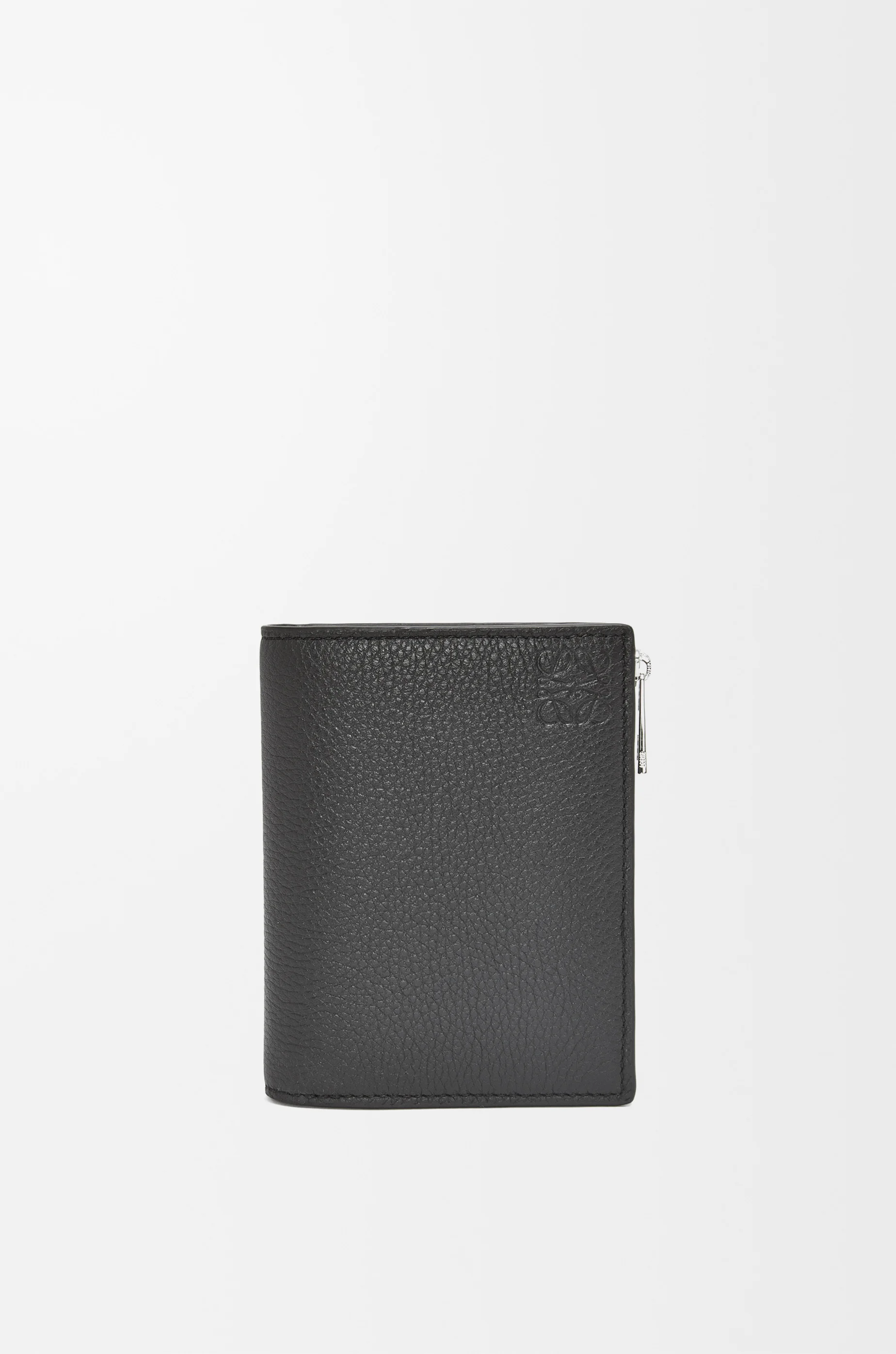 Slim compact wallet in soft grained calfskin. - Six card slots, four slip pockets, one large note pocket - One zipped coin compartment with calfskin pull - Snap button closure - Calfskin lining - Embossed Anagram Colour: Black Metallic colour: Palladium Main material: Soft Grained Calf Weight: 0.09 kg Height: 11.8 cm Width: 9.3 cm Depth: 1 cm Made in: Spain