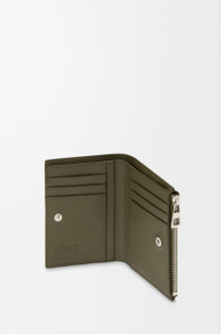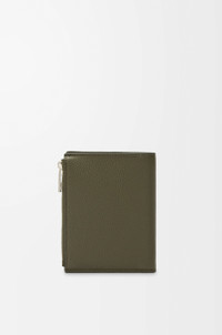 Slim compact wallet in soft grained calfskin. - Six card slots, four slip pockets, one large note pocket - One zipped coin compartment with calfskin pull - Snap button closure - Calfskin lining - Embossed Anagram Colour: Khaki Green Metallic colour: Palladium Main material: Soft Grained Calf Weight: 0.09 kg Height: 11.8 cm Width: 9.3 cm Depth: 1 cm Made in: Spain