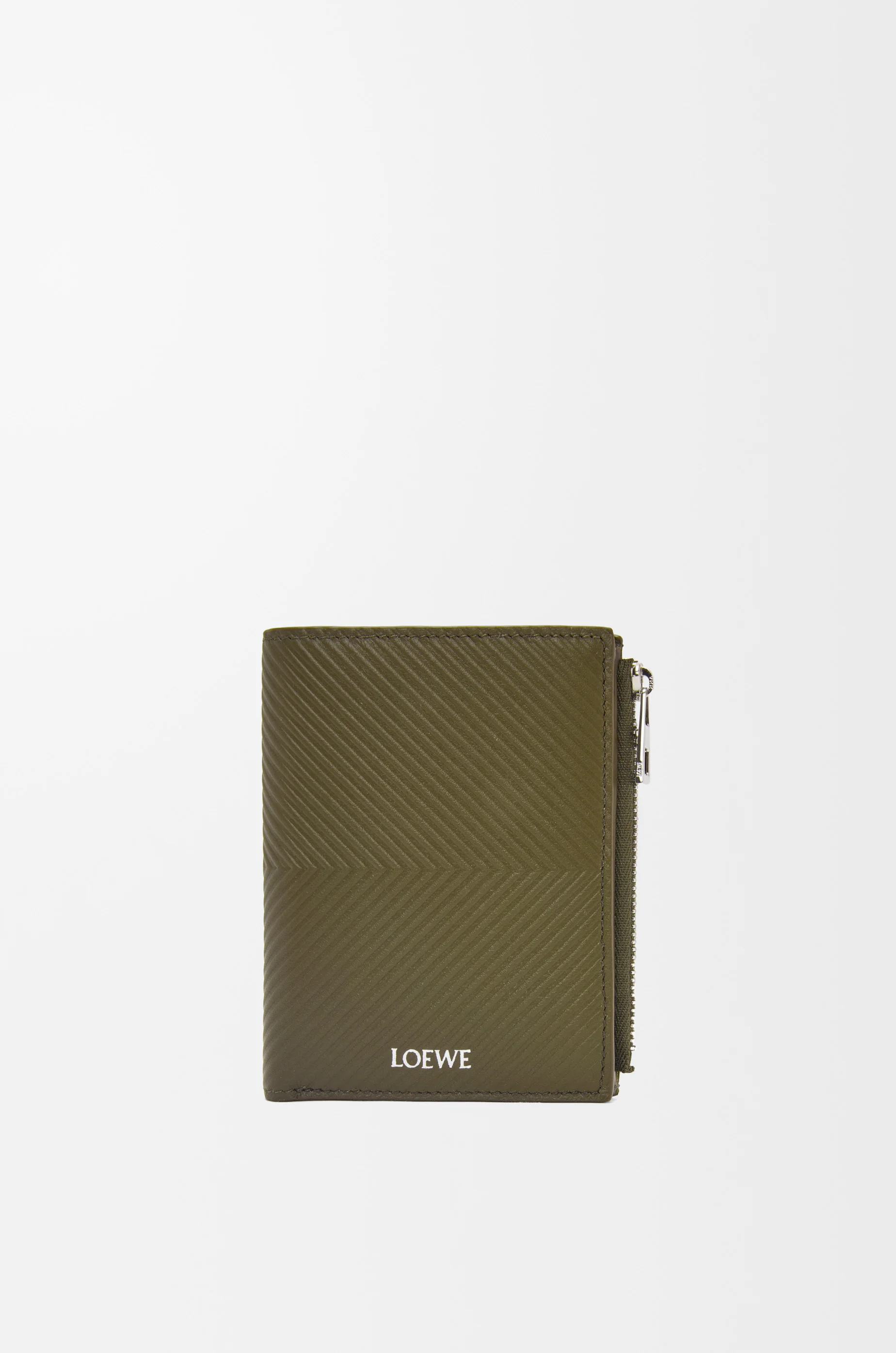 Slim compact wallet in classic calfskin embossed with a chevron pattern. - Zip coin compartment - Calfskin zip pull - Snap button closure - Six card slots, four slip pockets and one larger pocket for notes - Calfskin lining - Silver embossed LOEWE Details - Colour: Dark Khaki Green - Metallic colour: Palladium - Main material: Classic Calf - Weight: 0.09 kg - Height (cm): 11.8 - Width (cm): 9.3 - Depth (cm): 1 - Height (inch): 4.6 - Width (inch): 3.7 - Depth (inch): 0.4 - Model ID: C779W73X01 - CIL: 0011110350 - Made in: Spain